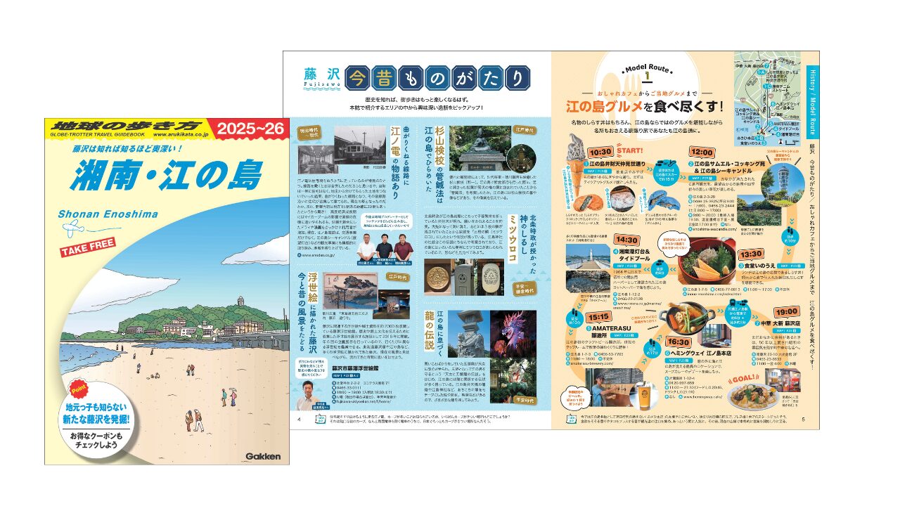 藤沢市から制作委託を受けた観光総合パンフレット。2024年の初版に続く、2025~26年版は「地球の歩き方」ならではの取材力と編集力を活かした第2弾です。「よりディープに」をテーマに、湘南のビーチや江の島に加え、田園エリアや歴史スポットも紹介。4つのエリア別に観光・グルメ情報をまとめ、各ページの“こぼれネタ”で新たな発見を楽しめます。