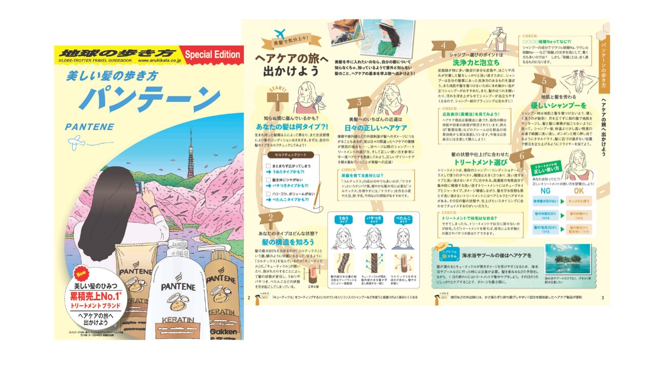 「ヘアケアの旅へ出かけよう」をコンセプトに、髪タイプのセルフチェックや各自の髪悩みに合わせた製品の選び方など、美しい髪へと導くヘアケアのポイントをコンパクトにまとめました。世界180ヵ国でグローバルに展開、各地に自社研究所を有するパンテーン製品の国別の特徴など豆知識も紹介しています。