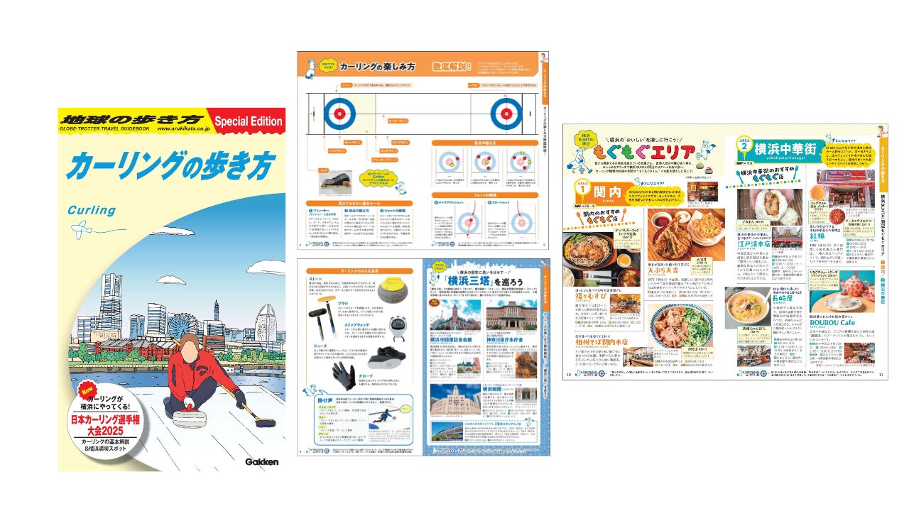 「日本カーリング選手権大会2025」の横浜開催に合わせて制作。カーリングの楽しみ方やルールなど基礎知識の解説のほか、会場となった横浜BUNTAI周辺の「もぐもぐ」スポットを紹介しています。横浜市営地下鉄横浜駅や観光案内所など、横浜市内各所でも配布されました。