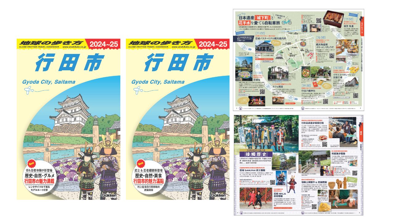 城下町と花手水を愛でる自転車旅のモデルコースをはじめ、行田の歴史と文化が感じられる体験スポットを紹介。歴史と自然が調和する「さきたま古墳公園」や忍城址のある「水城公園」、世界最大の田んぼアートなど、観光の見どころを多数掲載しています。インバウンド需要の開拓に向けて、同一内容の繁体字版も制作しました。