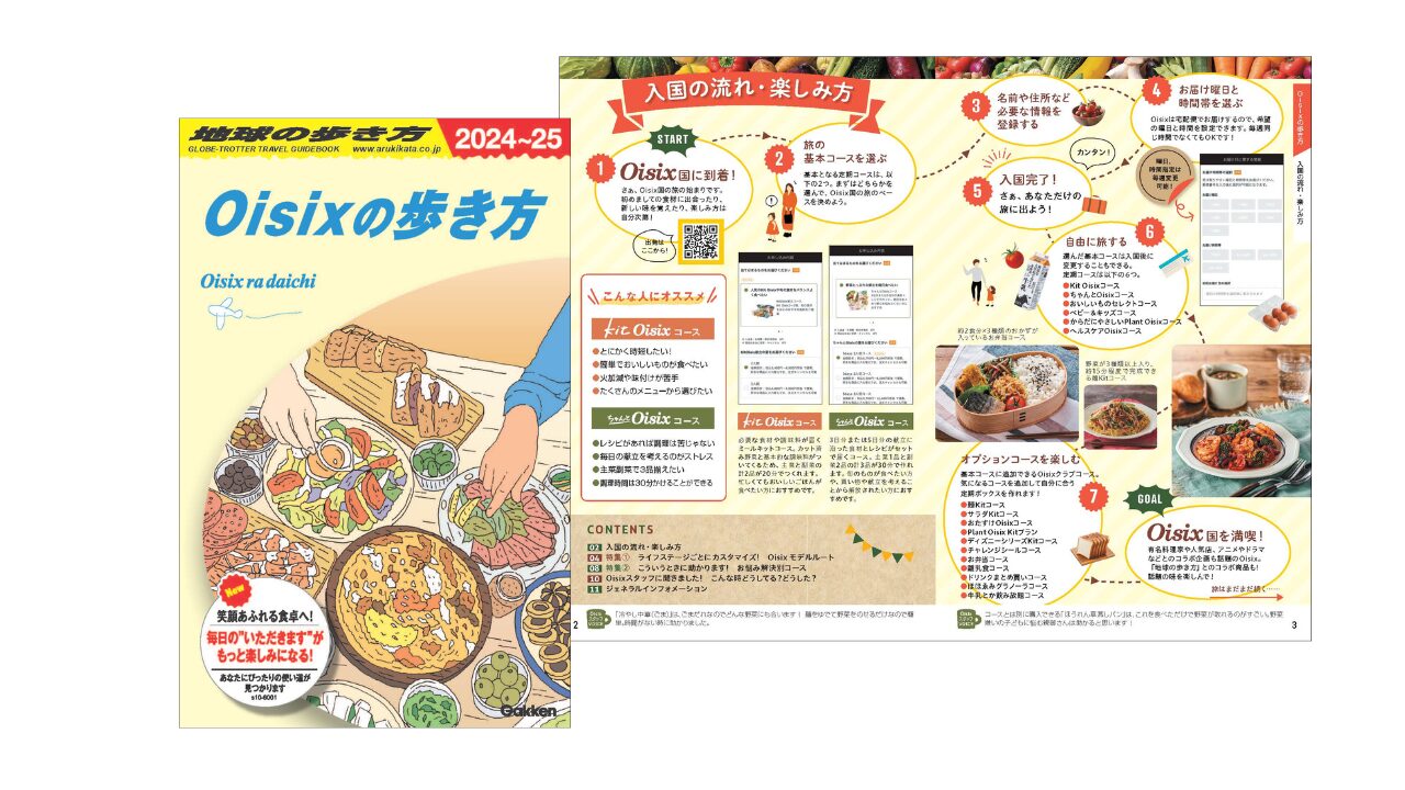 Oisixへの入会を旅になぞらえ「Oisix国への入国」として、入国方法や楽しみ方を紹介しました。家族構成や生活環境にあわせた定期宅配コースの選び方、「食事」「料理」に関するお悩みを解決するコース提案、Oixisスタッフによる「商品ベスト 3」と活用法アドバイスなどを特集したほか、巻末には地球の歩き方ならではの「ジェネラルインフォメーション」ページを設けました。
