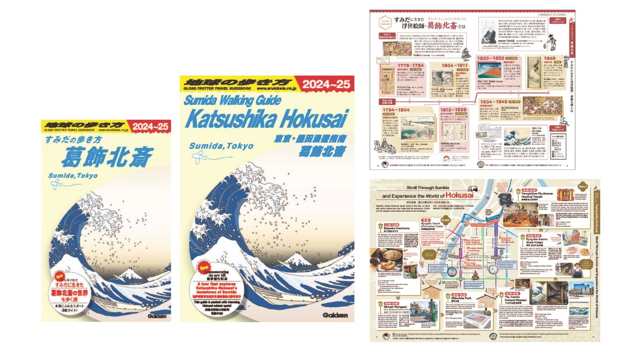 新千円札発行記念として制作した墨田区とのコラボ第二弾。「北斎のまち すみだ」の周知を目的に、生涯のほとんどを「すみだ」で過ごしたという北斎ゆかりの場所をめぐるモデルコースや北斎通りのグルメなど街歩きスポットを紹介しました。また、英語・中国繁体字併記の多言語版をB5サイズで作成し、どちらも両国観光案内所などで配布しました。
