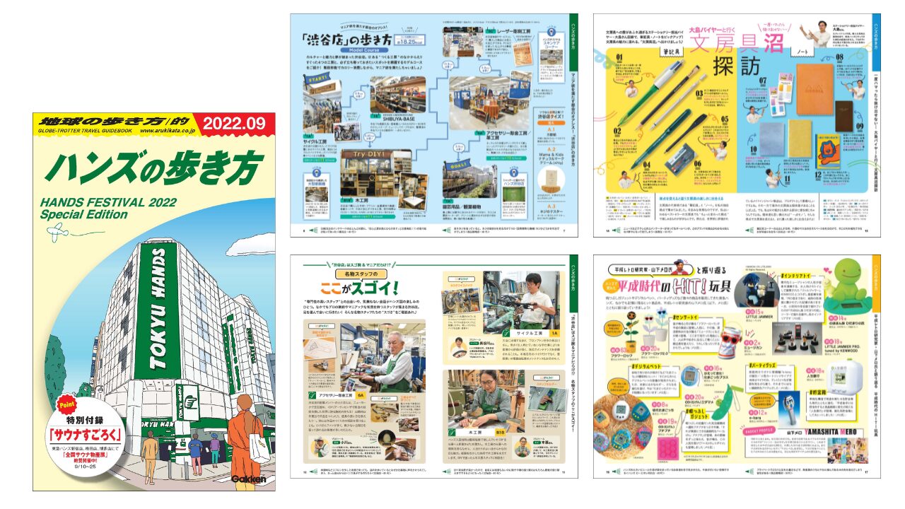 2022年開催のハンズフェスで購入者特典として配布。知識豊富な名物スタッフの紹介やステーショナリーバイヤーおすすめの文房具、ハンズで売れた平成時代のヒット玩具を振り返るページなど、ハンズ愛にあふれる多くの人たちが登場するバラエティー豊かな誌面を制作しました。