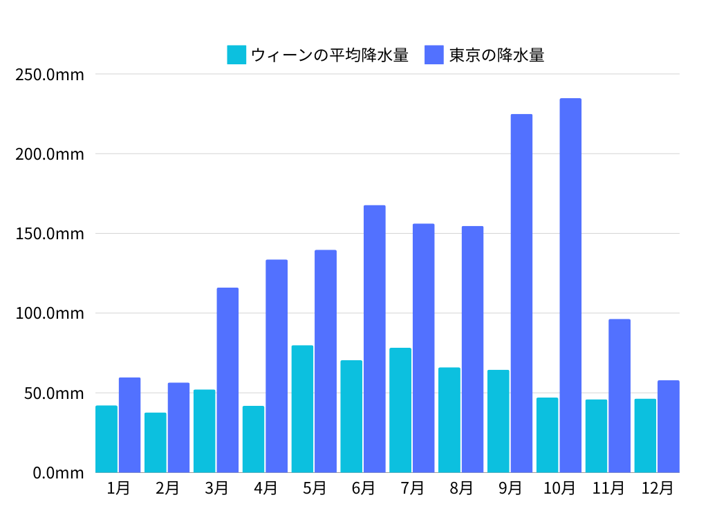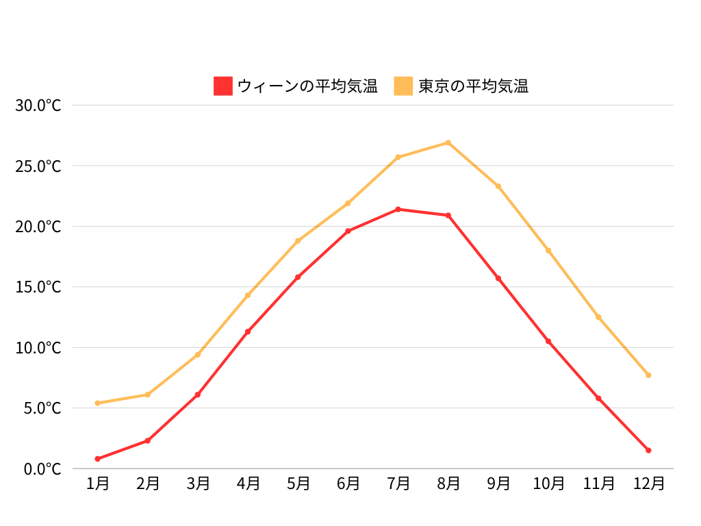ウィーンの年間平均気温は約10℃で、東京(約16℃)よりも涼しい。降水量は東京よりも少なく、特に冬は乾燥した日が多い。夏は湿度が低く過ごしやすい一方、冬は冷え込みが厳しいため、服装で調整することが重要だ。また、春と秋は気温が穏やかで観光に適したシーズンと言える。ウィーンでは、歴史ある建築や公園を楽しむ屋外観光が多いため、快適な靴と服装が必須だ。