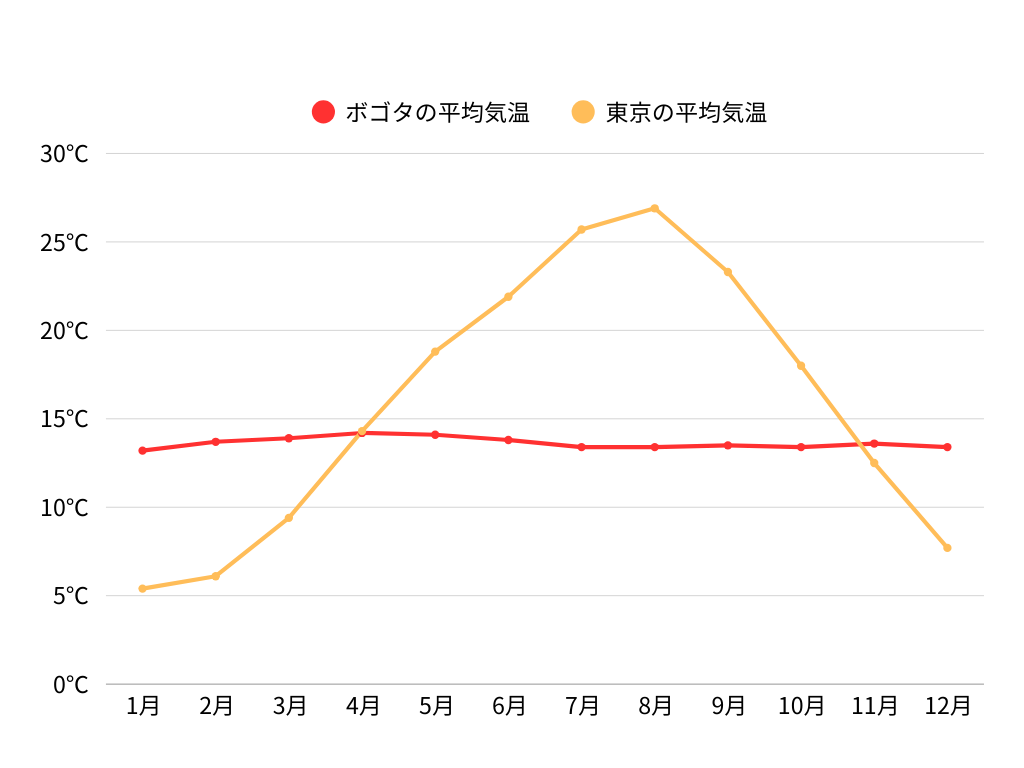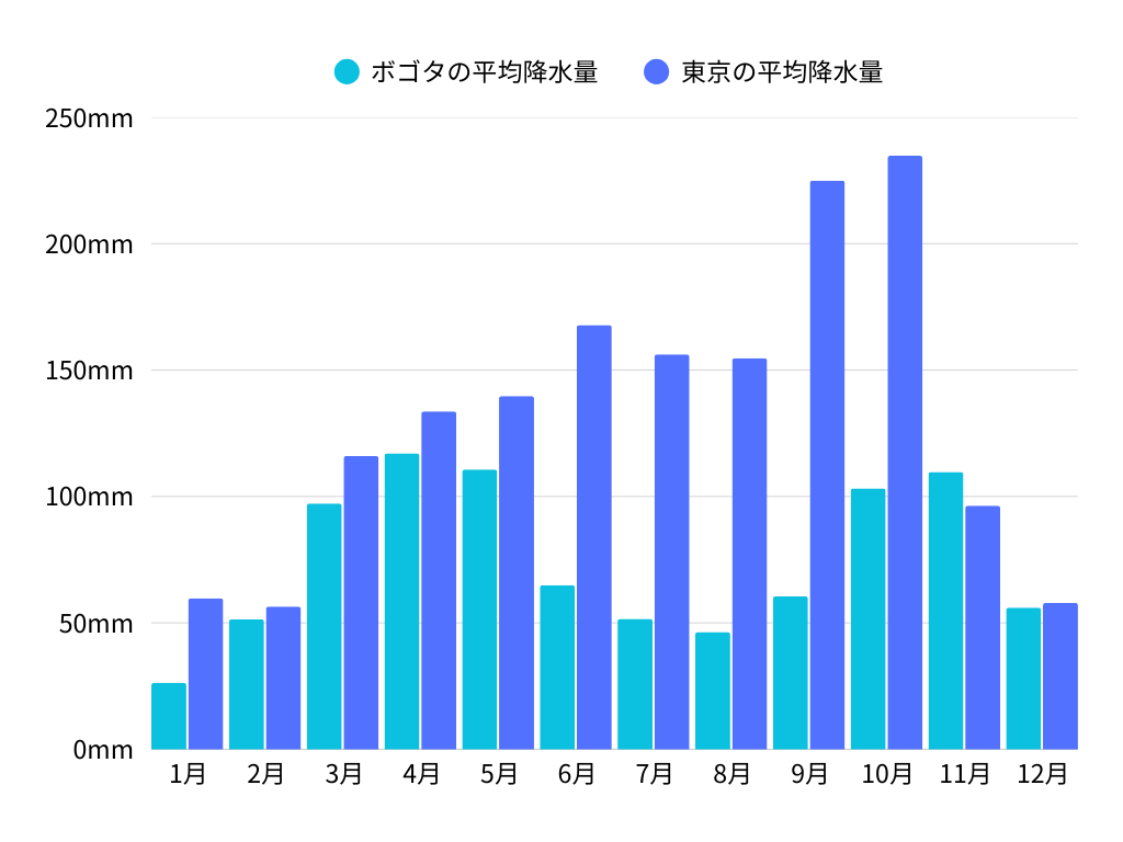 ボゴタの年間平均気温は約14℃ですが、山岳地に位置しているため、日中と夜間の寒暖差が大きいです。そのため、常に防寒具を用意しておくことをおすすめします。また、ボゴタでは冷たい雨が降ることが多いため、折りたたみの傘を持っていると便利です。