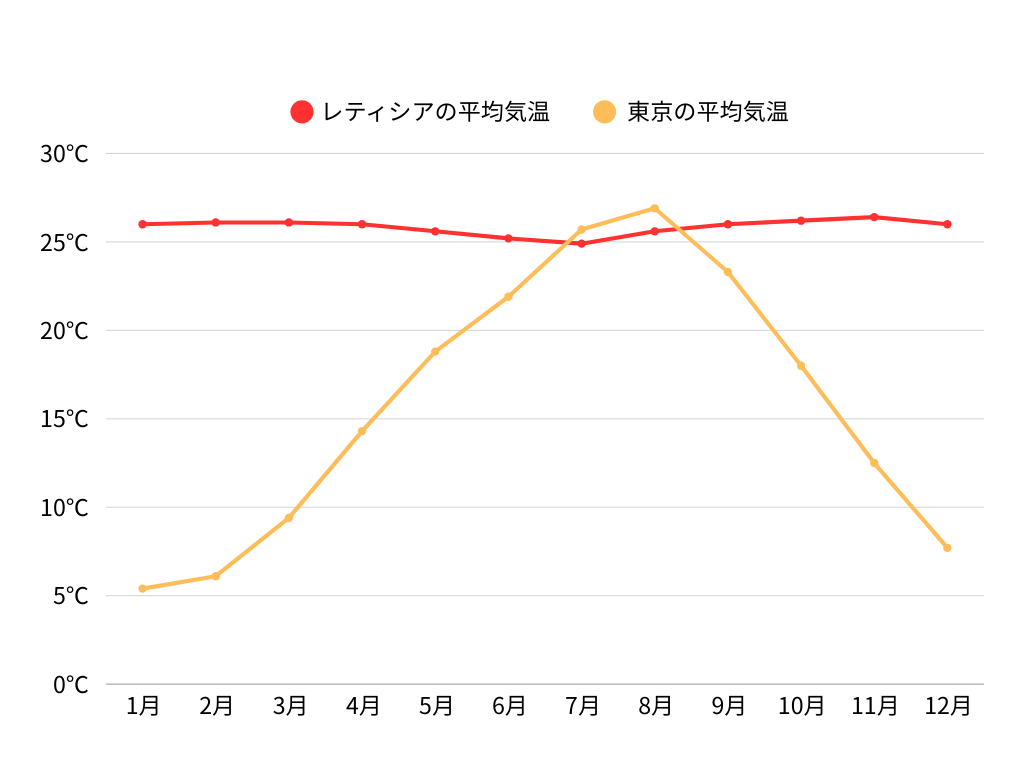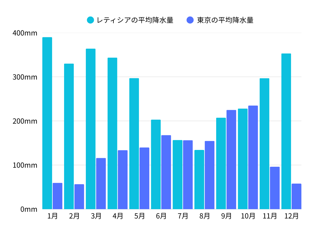 レティシアでは、10月から5月にかけて雨季があり、ほぼ毎日スコールが降ります。突然の雨に備えて、レインコートを用意しておくと安心です。