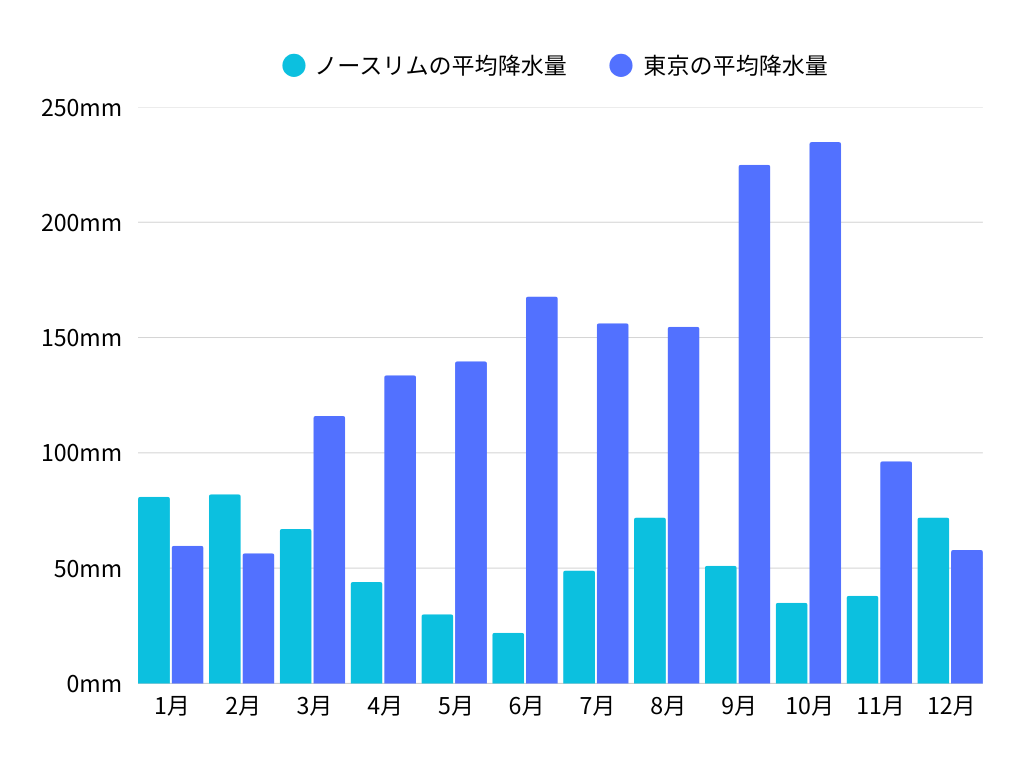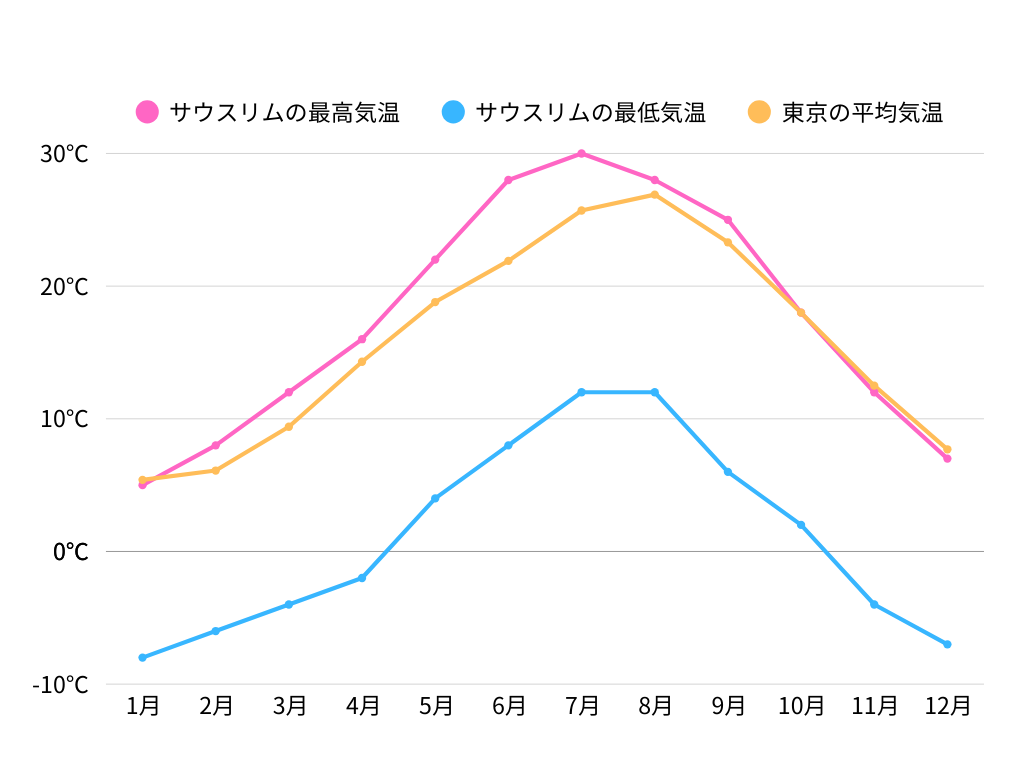 東京は気象庁世界の天候データツール平年値から、グランドキャニオン国立公園の各地点は地球の歩き方ガイドブックからグラフを作成