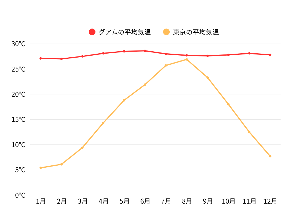 グアムは年間を通じて温暖な海洋性亜熱帯気候に恵まれており、常に泳ぐことができるリゾート地です。