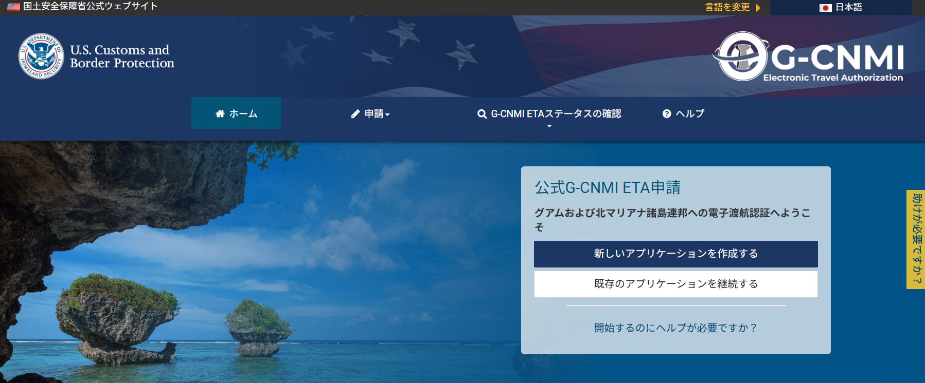 Guam-CNMI ETA公式ページの画面右上にある「Change Language」をクリックすると、言語が選択できます。日本語に変更したら「新しいアプリケーションを作成する」をクリック。「セキュリティ通知」の画面が表示されるので、確認のうえ「確認して続行」を押します。