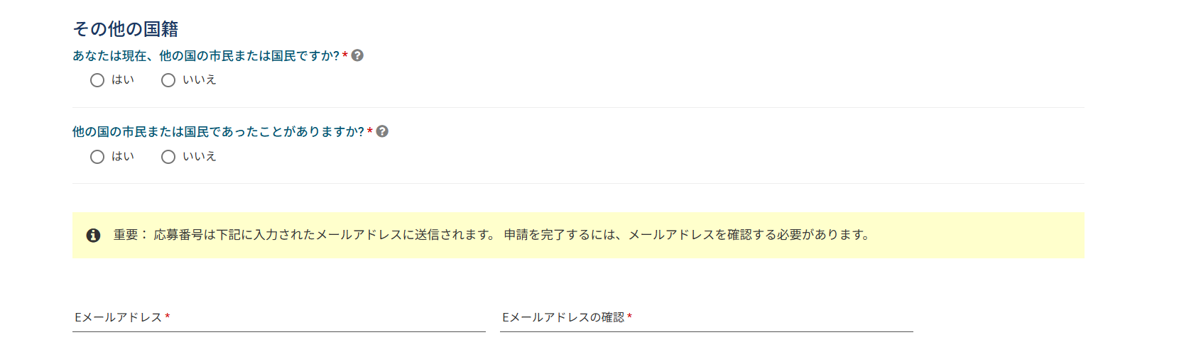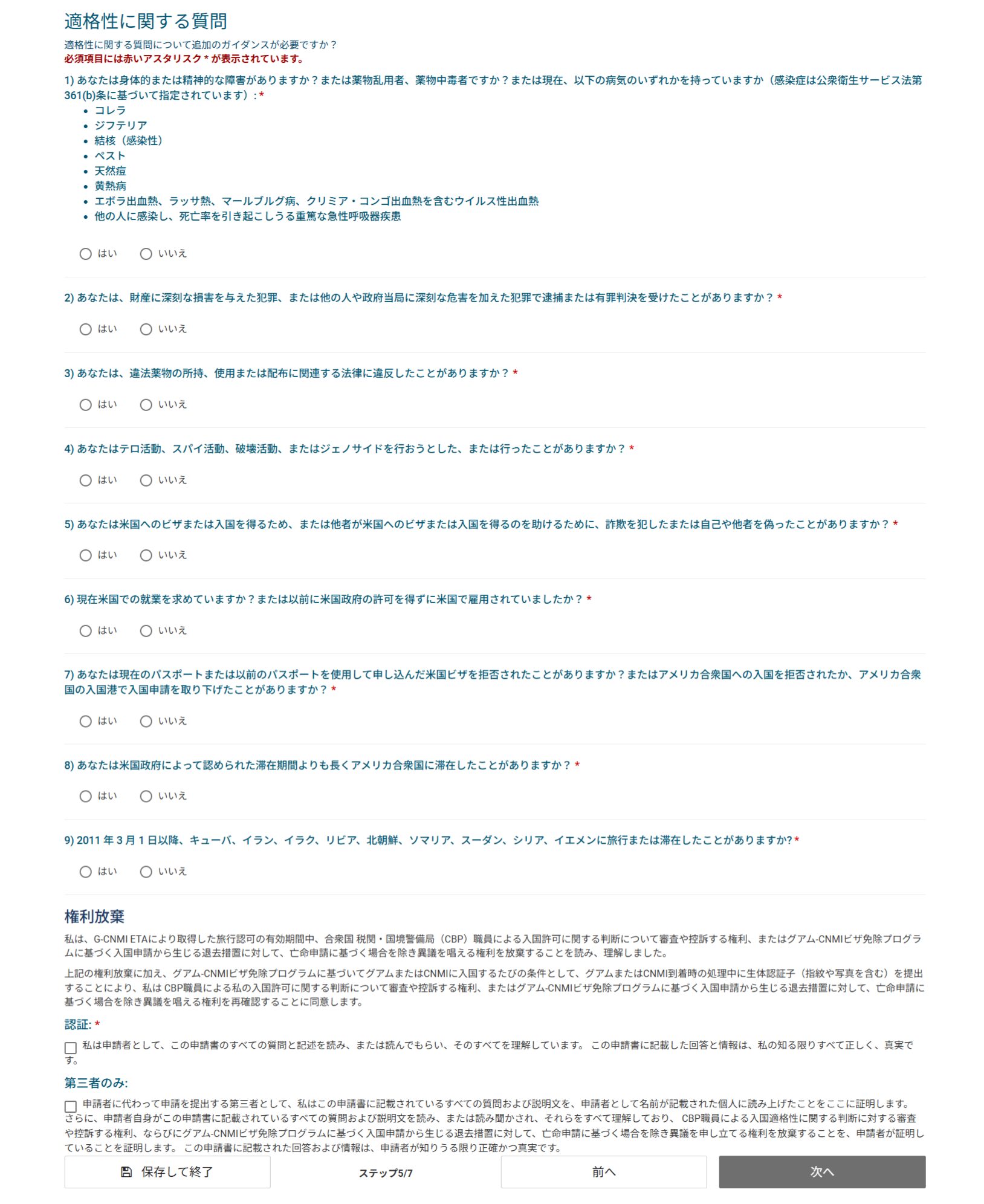 続いて、適格性に関する質問が表示されるので、各項目をしっかりと読み、「はい」または「いいえ」で回答します。