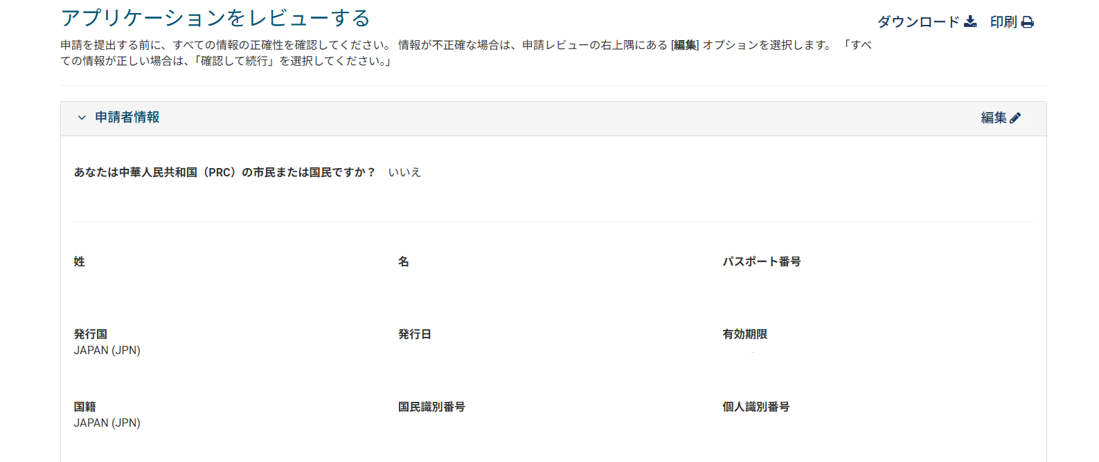 「あなたは中華人民共和国(PRC)の市民または国民ですか?」という質問が表示されるので、日本国籍の場合は「いいえ」をクリックし、申請者のパスポート情報の入力に進みます。