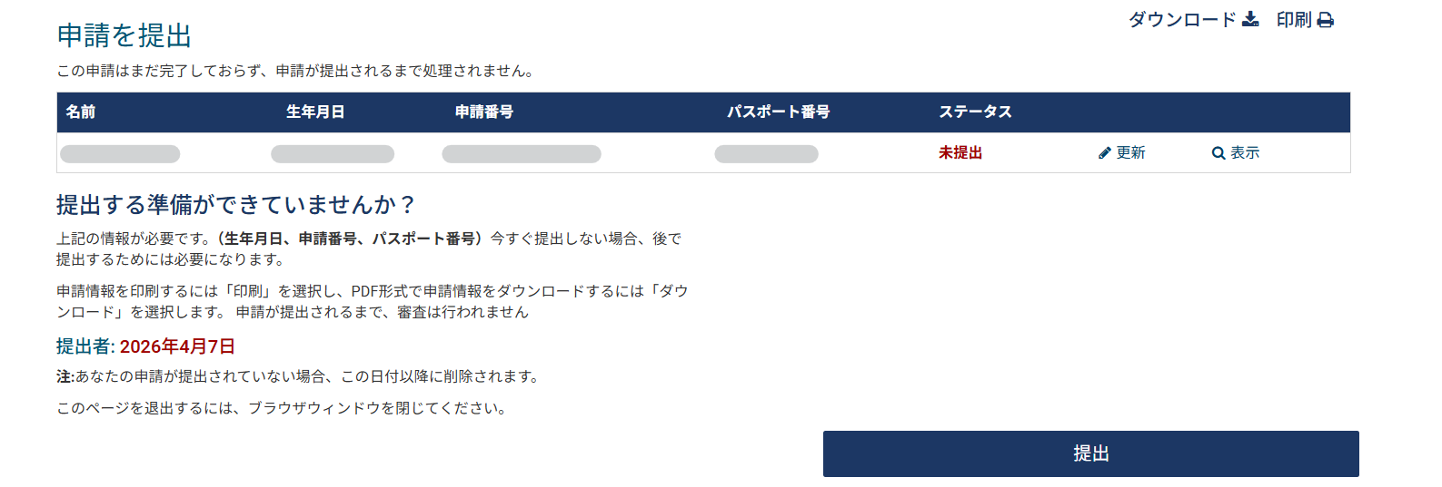 全ての入力が完了したら、「提出」をクリックして完了。申請番号は必ずメモをしておきましょう。