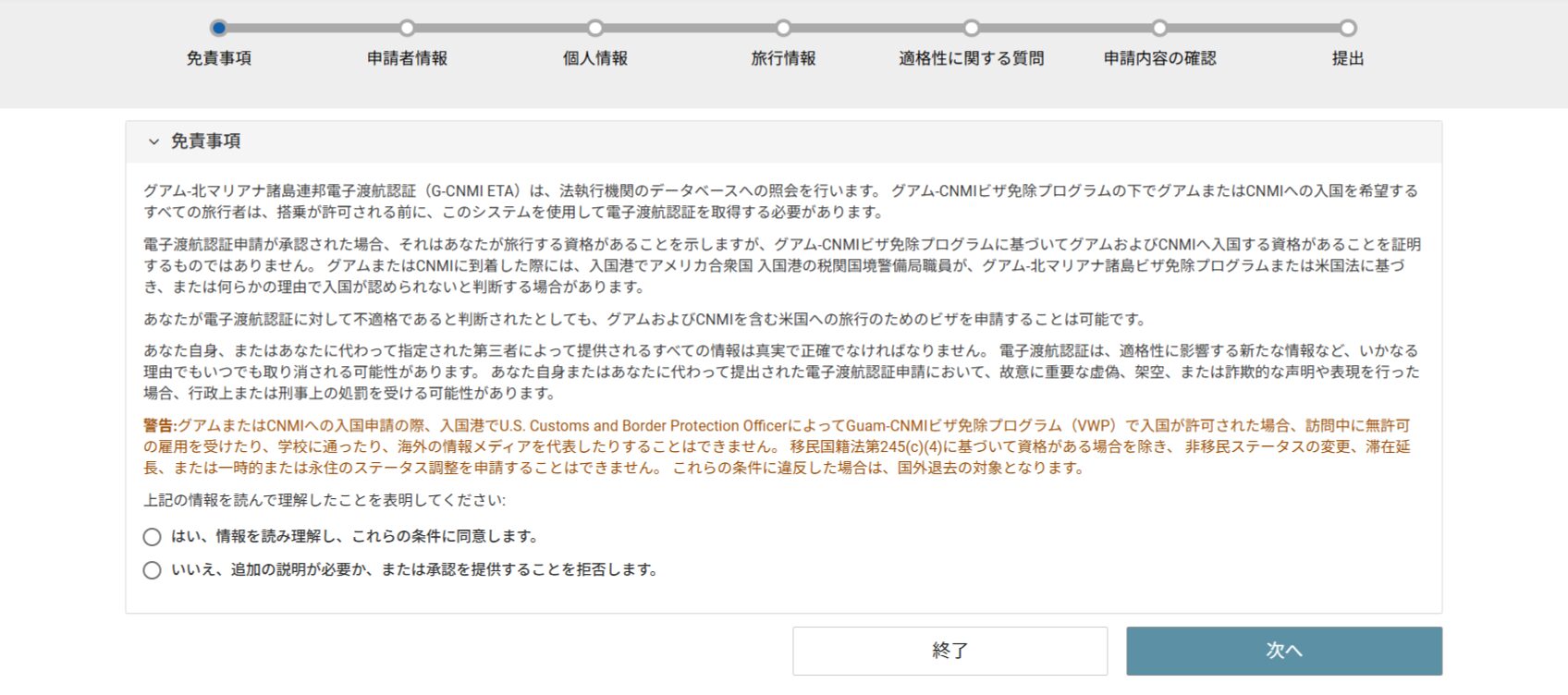 「免責事項」の画面が表示されるので、内容を確認のうえ「はい、情報を読み理解し、これらの条件に同意します。」を選択し、「次へ」をクリック。