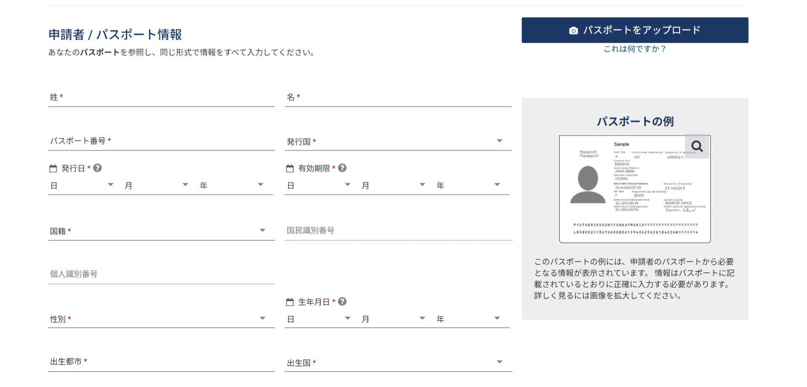 右上の「パスポートをアップロード」をクリックし、「カメラから」を選択すればPCのカメラでパスポートの顔写真ページをスキャンでき、自動でパスポート情報を読み込んでくれます。パスポートの顔写真ページの画像を事前にPCにアップロードしておけば、「ギャラリーから」を選択して読み込ませること可能。情報が読み込まれたら、氏名やパスポート番号、生年月日などに間違いがないかチェックします。