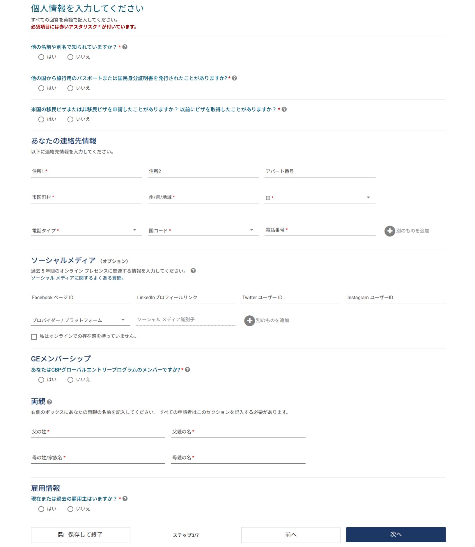 次に、日本の連絡先(住所や電話番号など)や両親の名前、雇用情報といった個人情報を入力していきます。入力項目は英語で入力する必要があります。