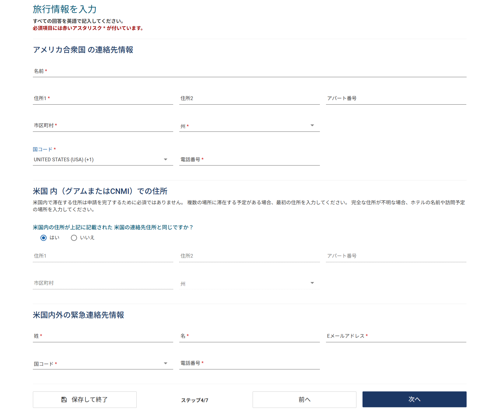 「アメリカ合衆国の連絡先情報」では、グアムで滞在するホテル名と住所、電話番号を入力します。「米国内外の緊急連絡先情報」(名前、メールアドレス、電話番号)を入力して「次へ」をクリック。