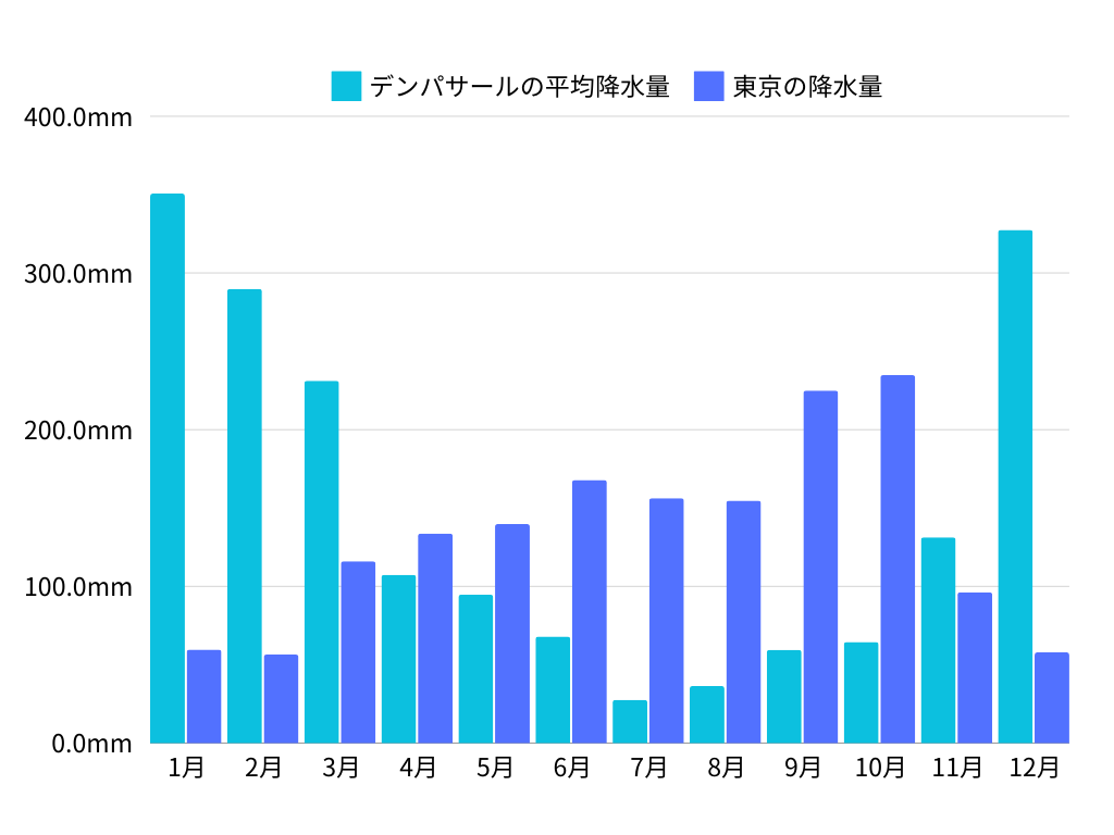 デンパサールはインドネシアのバリ島に位置し、熱帯モンスーン気候に属している。年間の平均気温は26〜30℃と安定しており季節は乾季と雨季と2つ。乾季は晴天が続き湿度も低く、観光やアウトドアアクティビティに最適な時期だ。雨季は降水量が多く1月は月間300〜400mmに達することもあるが、短時間で激しい雨が降るスコールが中心。