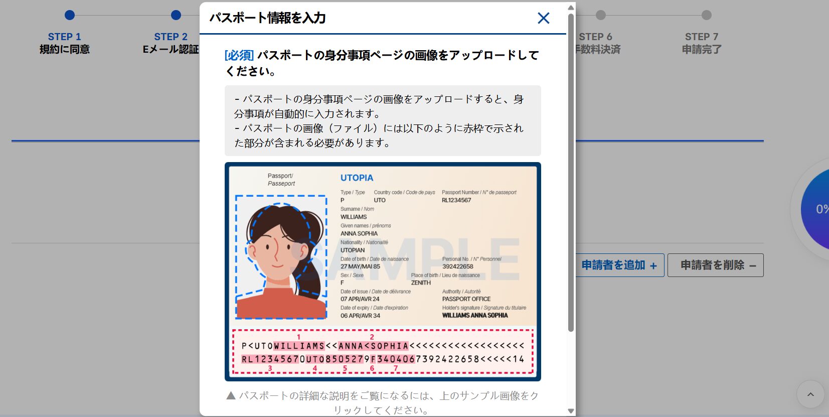 パスポートの顔写真があるページを撮影した画像を、「画像添付」からアップロードします。自動でパスポート情報が反映されるので、相違がないか確認し、「確認」を押します。