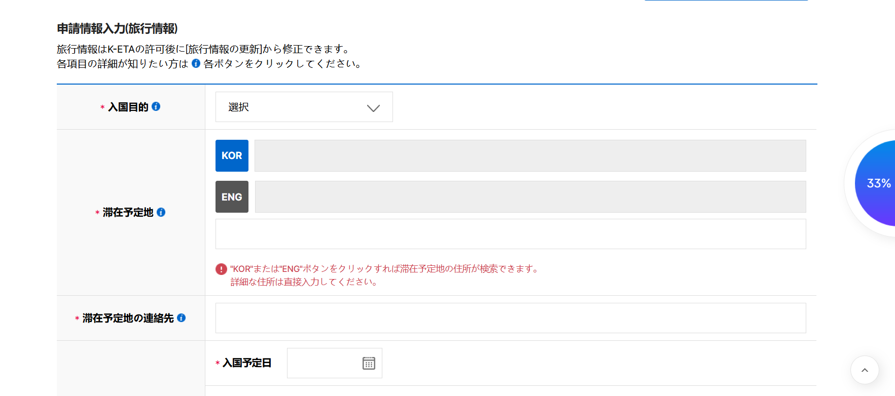 ②韓国での宿泊先の住所を入力。ホテルなど滞在先が決まっている場合は韓国語の住所をコピペするとスムーズに入力できる。未定の場合はNONEと入力
