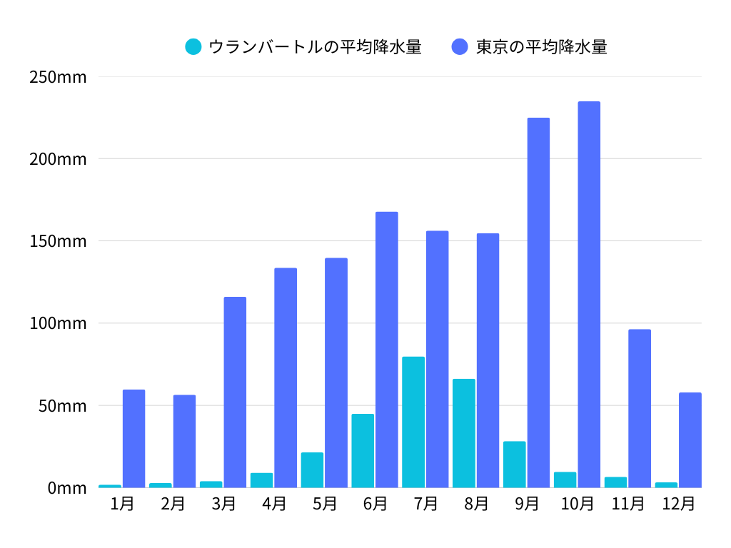 ウランバートルと東京の年間降水量を比較