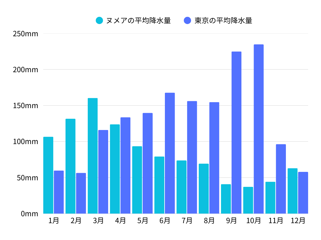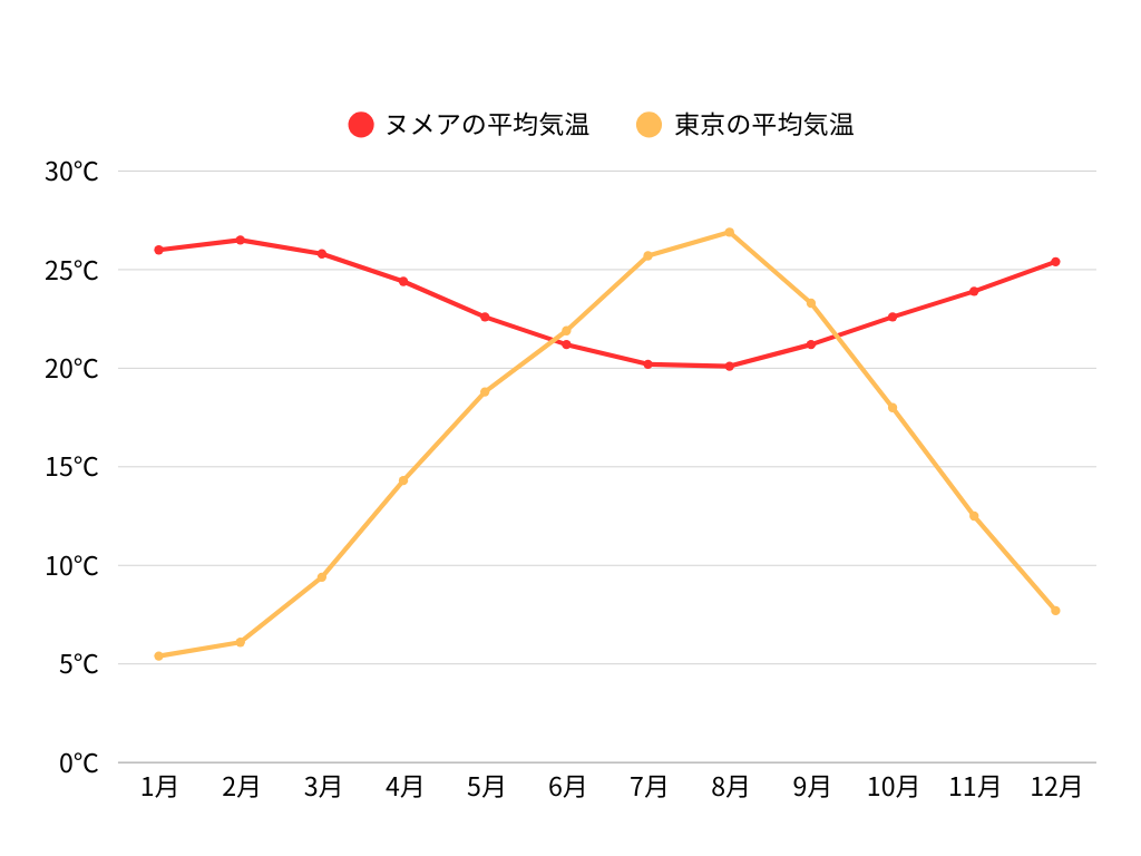 ニューカレドニアは、基本的にはさわやかな亜熱帯気候です。年間総降水量は日本より少なく、平均気温は23℃、過ごしやすい気候です。南の島というイメージから、常夏のように思われがちですが、実際には春夏秋冬が存在します。