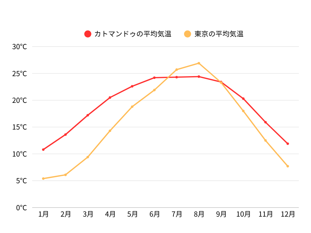 多くの人はネパールを寒い国と思いがちですが、実際には日本の奄美大島と同じくらいの緯度に位置しています。そのため、標高が高い場所に行かない限り、極端に寒いわけではありません。