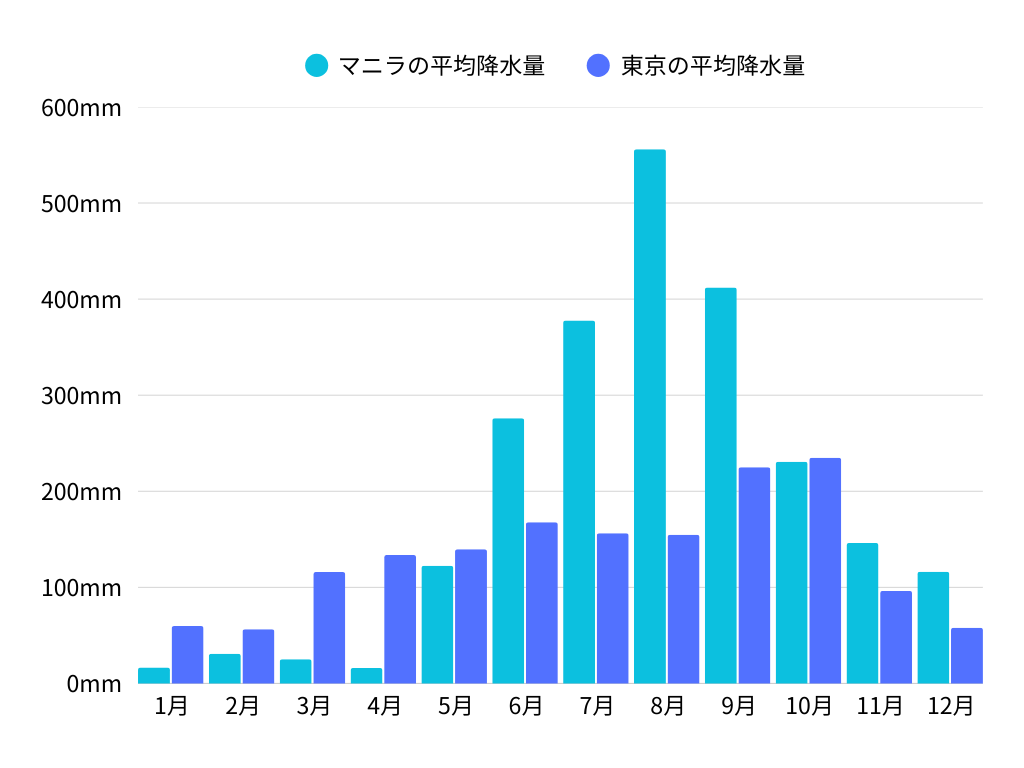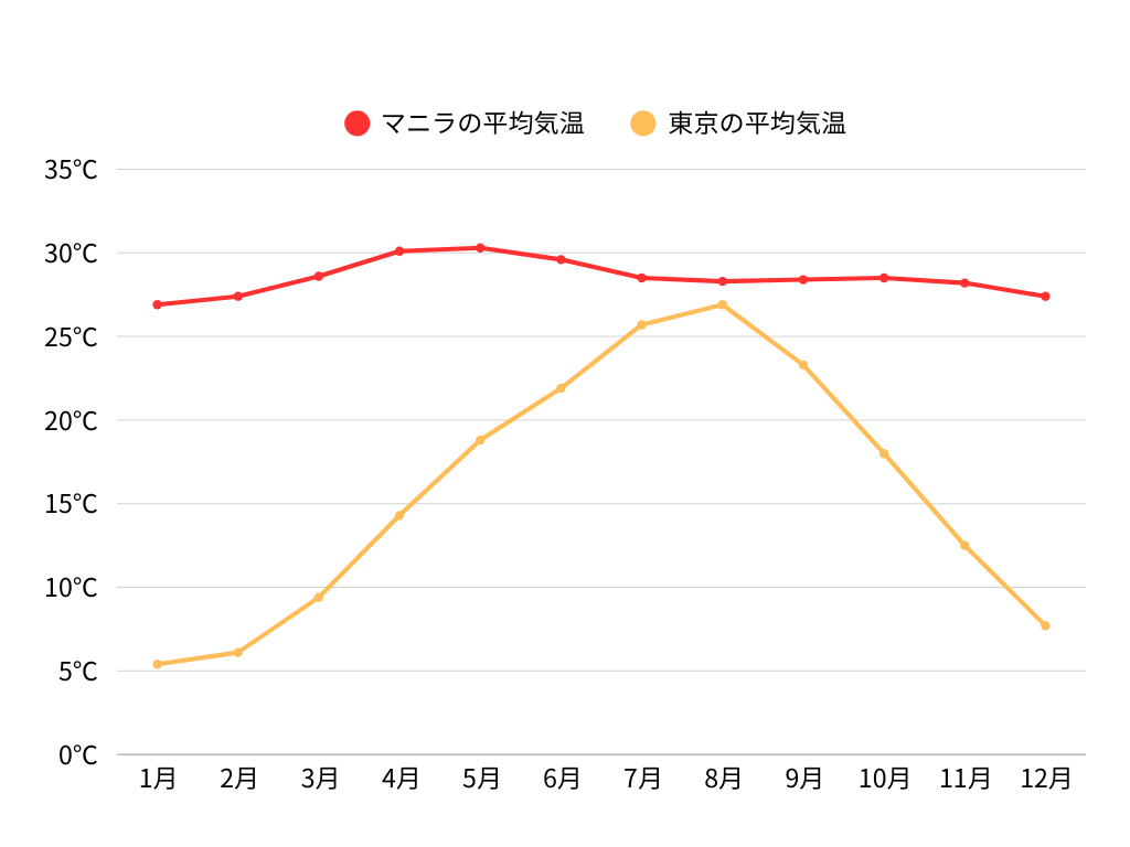 フィリピンは熱帯性気候に属し、年間を通じて暖かい気温が特徴です。年平均気温は26~27℃。雨期は6月から11月で、乾期は12月から5月です。ただし、地域によって気候に大きな差があるため、注意が必要です。