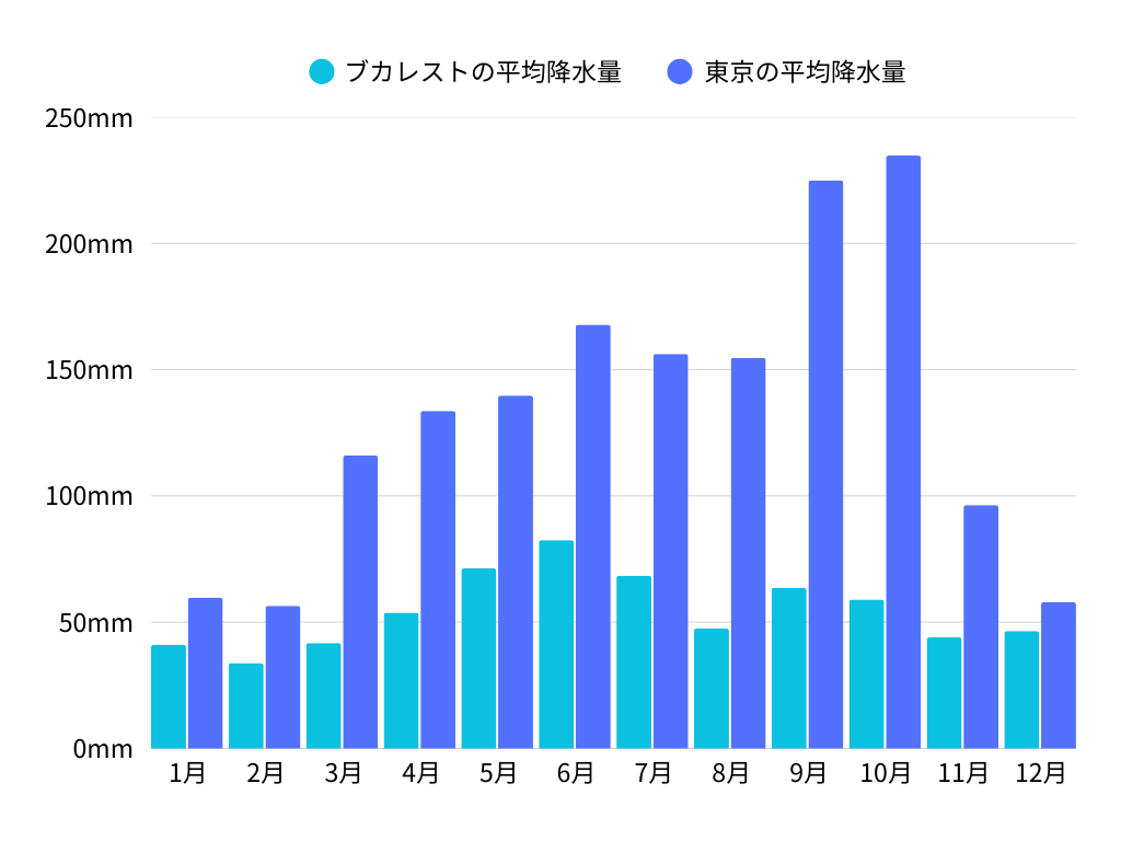ルーマニアは北海道とほぼ同じ緯度に位置し、大陸性気候に分類されます。日本と同様に四季があり、特にカルパチア山脈を境にして山岳部と平原部で気候が大きく異なります。山岳部では積雪が多く、冬は寒さが厳しくなります。夏でも朝晩は冷え込むことがあるため、上着を用意しておくことをおすすめします。