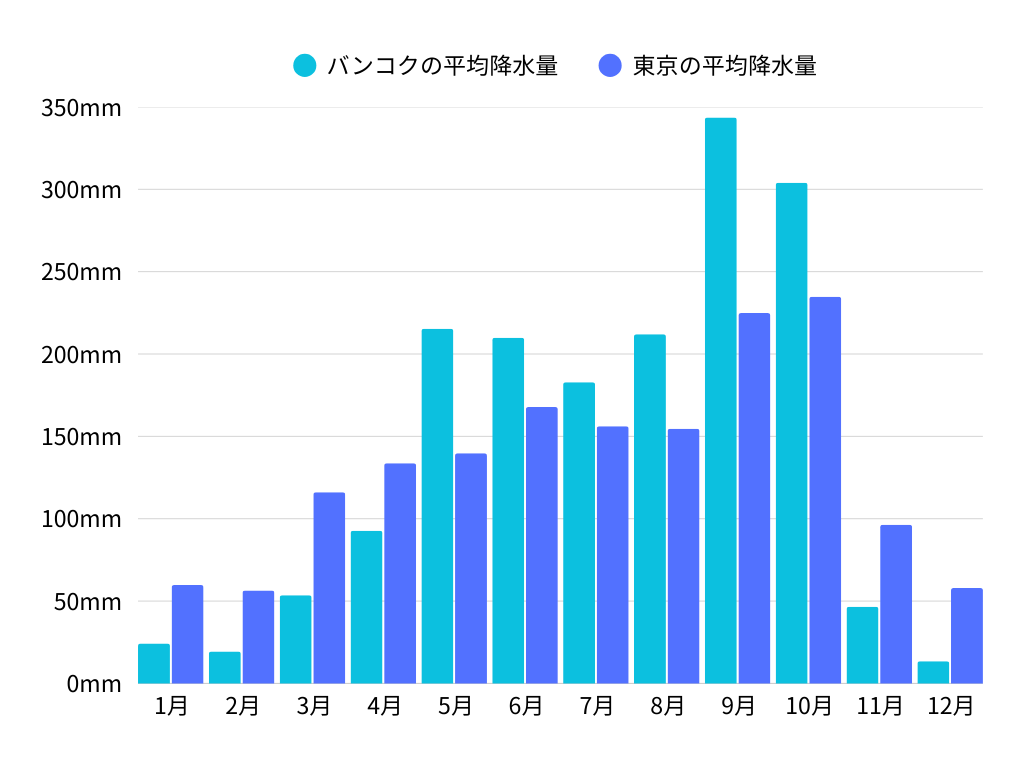 タイは熱帯に位置し、年間を通じて高温ですが、地域によって気候が異なります。季節は主に雨季、乾季、暑季(タイ気象局の分類では雨季、寒季、夏季)の3つに分けられます。