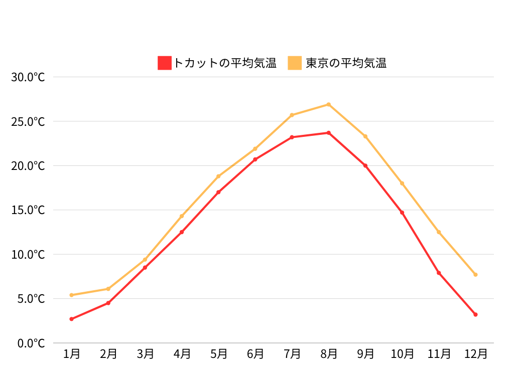 トカットはトルコ北部に位置し内陸性気候と海洋性気候の影響を受ける。夏は比較的暑いが湿度が低く平均気温は30℃前後。冬は寒く氷点下になる日も多いが積雪は稀。春と秋は温暖で過ごしやすく自然豊かな観光地巡りに適した気候だ。特に春には新緑が美しく秋には紅葉が広がる景色が魅力。
