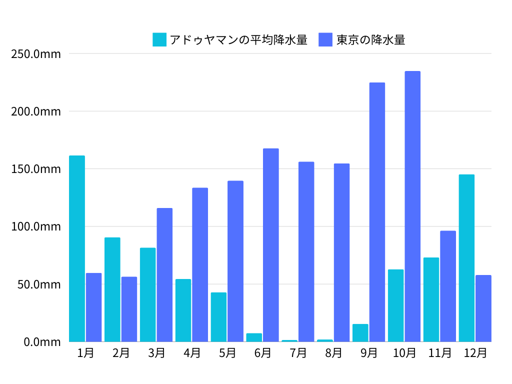 アドゥヤマンはトルコ南東部に位置し典型的な大陸性気候。夏は非常に暑く平均気温は35℃を超えることもある。湿度が低い乾燥した暑さのためこまめな水分補給をしよう。冬は寒さが厳しく氷点下に達することもある。平均気温は5~10℃程度。遺跡観光が多い地域のため季節ごとの適切な服装選びが重要だ。