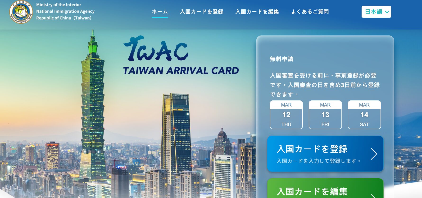 移民署の入国カード登録用サイトより、台湾到着日を含む3日前から登録可能。