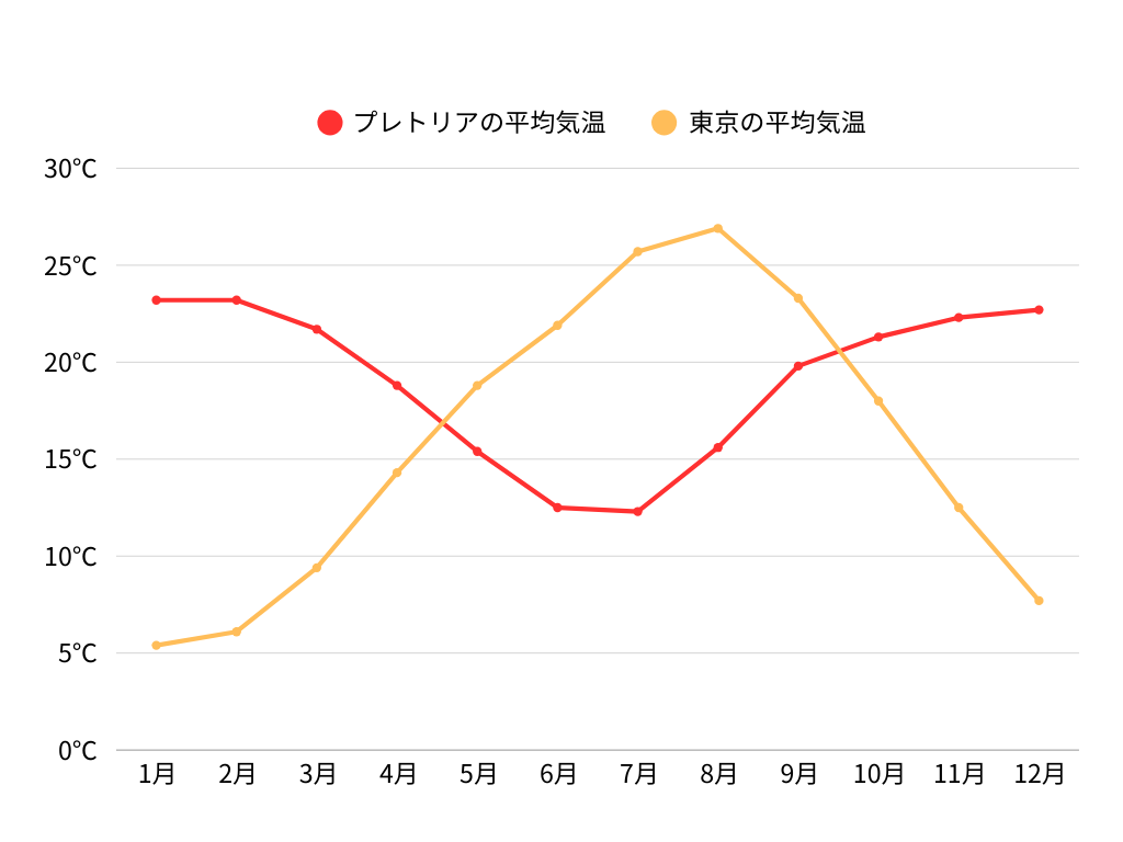 南アフリカは南半球に位置しており、夏季は10月から3月までと、日本とは季節が逆転しています。