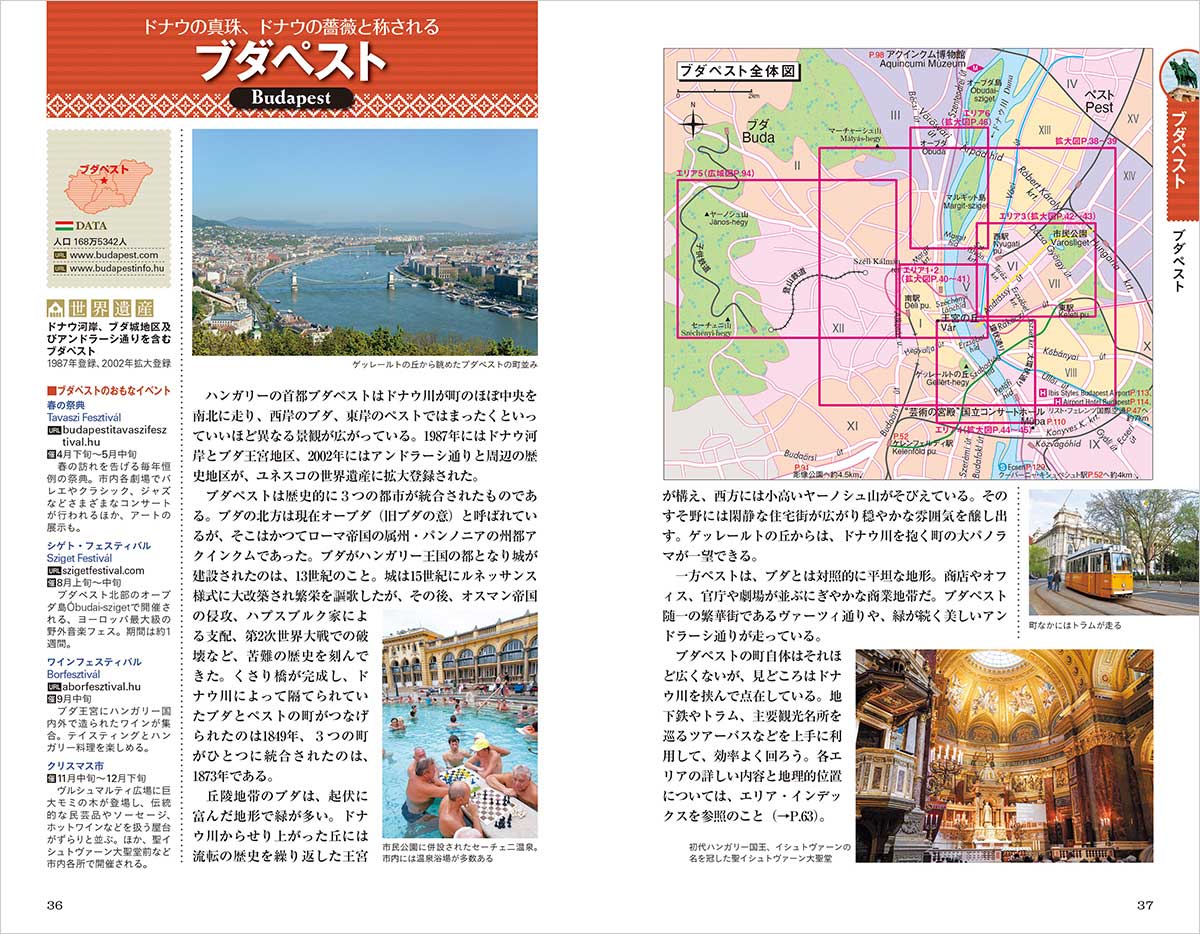 「ドナウの真珠」と称えられる歴史都市ブダペストや中世が香る美しい小都市、名高い貴腐ワインを巡るハンガリーガイドの決定版。