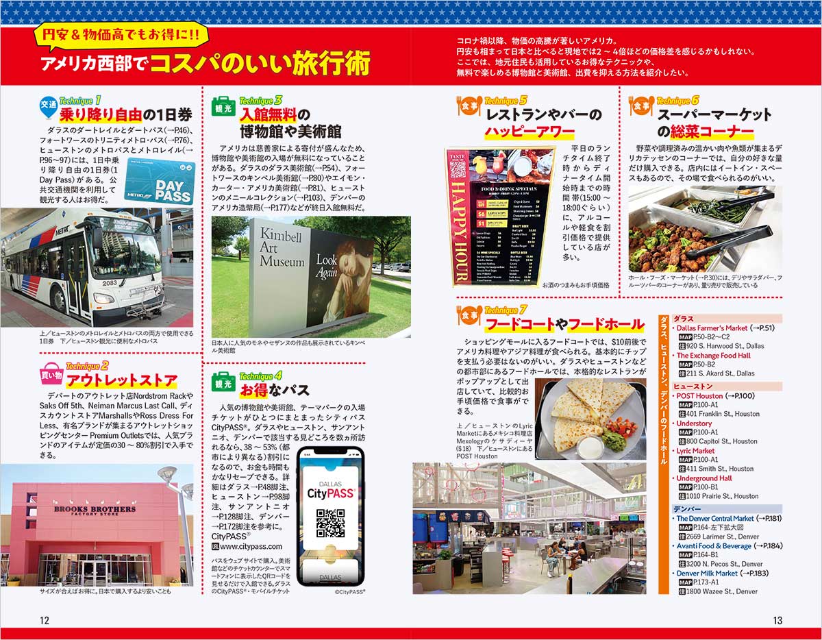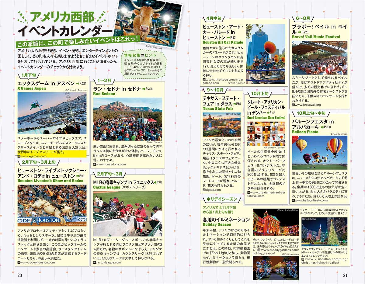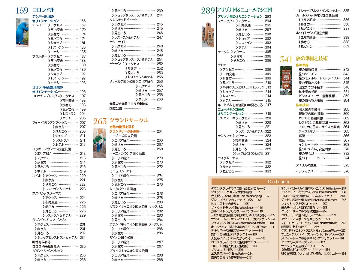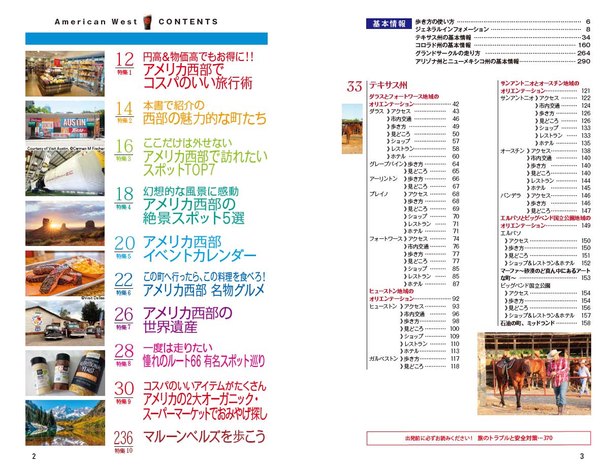 自然と都会の魅力の両方を兼ね備えたテキサス州(ダラス、ヒューストンなど)とコロラド州(デンバーなど)を中心に、ニューメキシコ州(サンタフェ、アルバカーキなど)、アリゾナ州(フェニックス、セドナなど)、グランドサークルを加えたガイドブック。日本からアクセスの良いヒューストン、ダラス-フォートワース、デンバーなどの都市を起点に周遊する、新しいアメリカ旅行を提案します。また、業務渡航で訪れるビジネスマンにとっても有益で実践的なアイデアや情報を多く掲載しました。