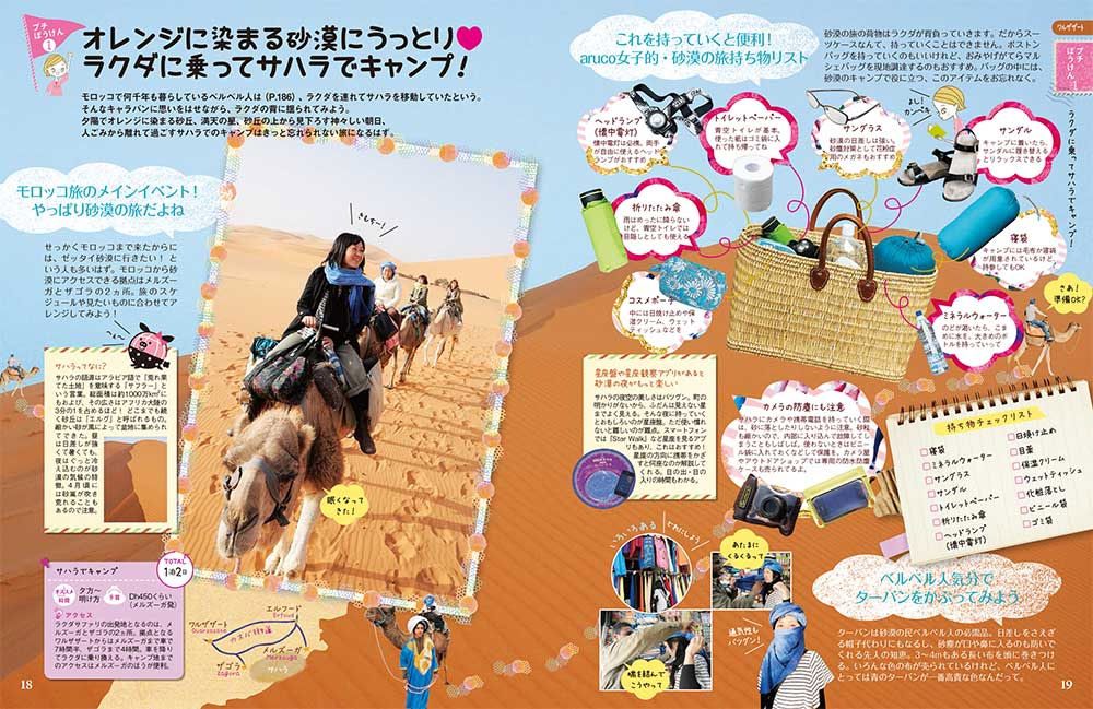エキゾチックな魅力あふれるモロッコで、心ふるえるプチぼうけんしちゃお☆ ラクダに揺られてサハラ砂漠でワクワクキャンプ、どこまでも青が続くファンタジックな町シャウエン探検、市場で探そうキュートなバブーシュ&カゴバッグ、本場のタジン鍋クッキング体験etc. ほらほら、知らないモロッコがい~っぱい!