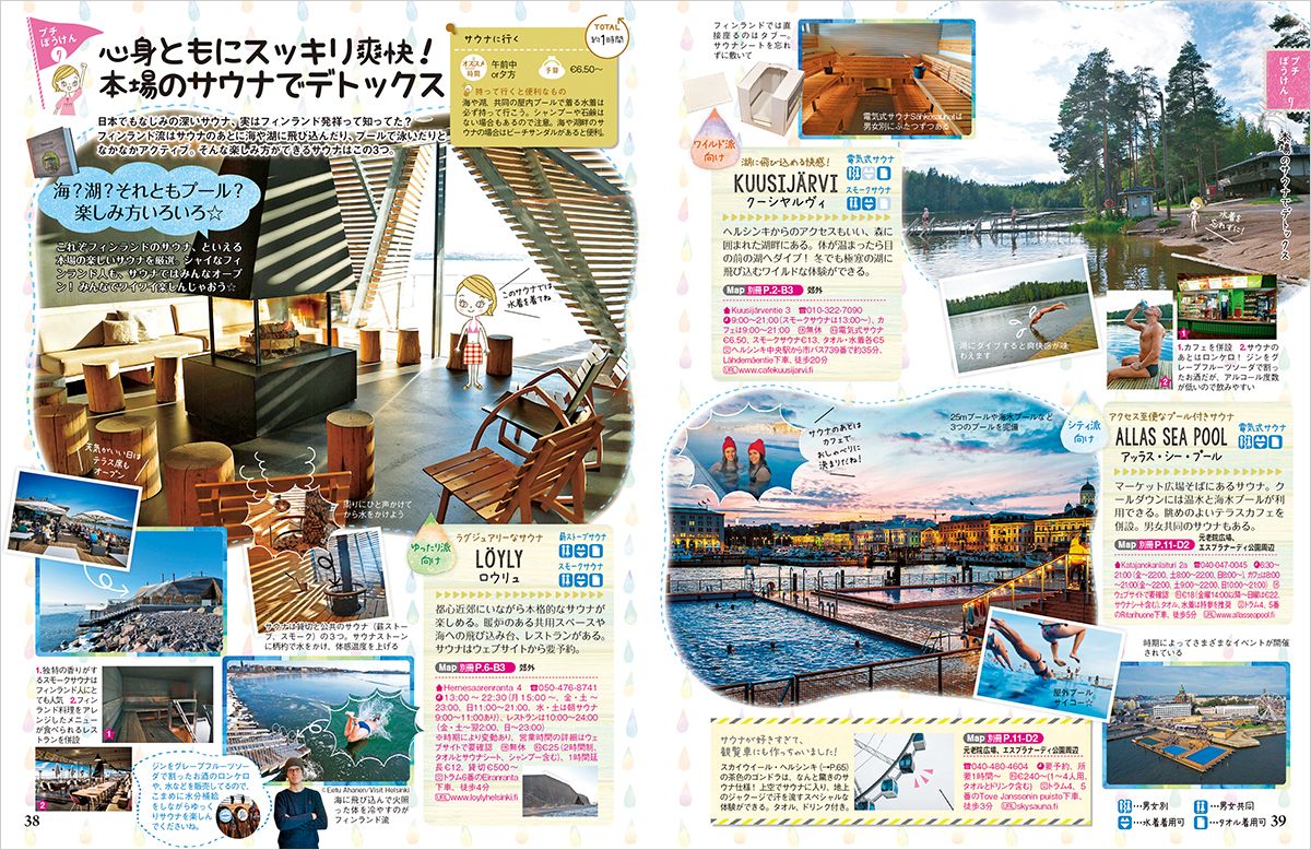 ヘルシンキ大聖堂 / ウスペンスキー寺院 / テンペリアウキオ教会 / カンピ礼拝堂 / ミュールマキ教会 / オーディ ヘルシンキ中央図書館 / 注目のカッリオ地区 / ヘルシンキの公園 / 世界遺産スオメンリンナ島 / エスポーでモダンアート探し / 『カレワラ』解説 ほか