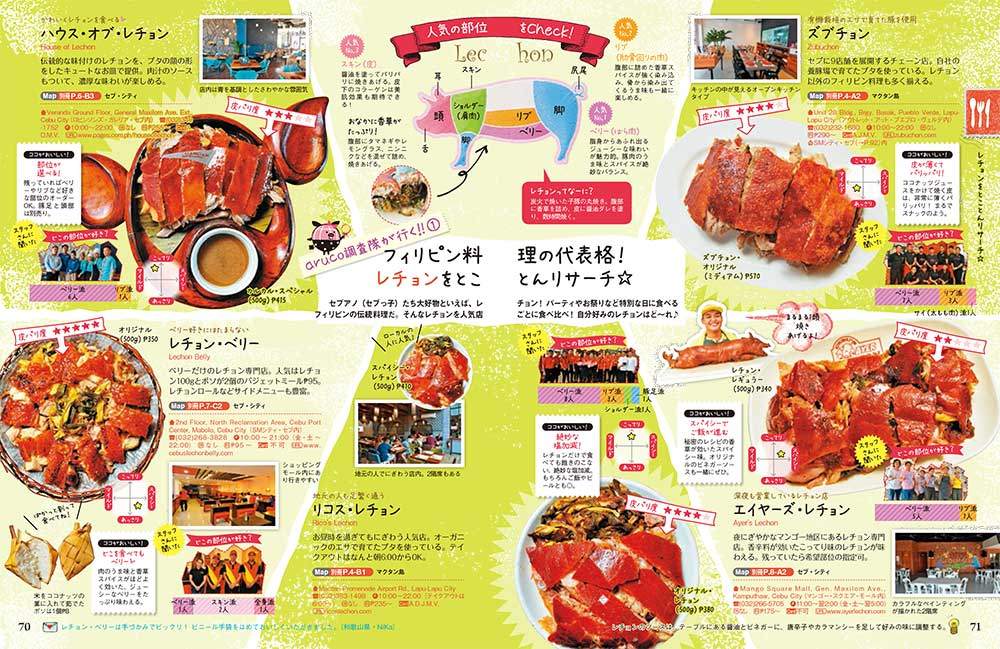 シーフードの名店、ローカルフードコレクション、フィリピン料理の代表格レチョンを食べ比べ、ジョリビーの秘密に迫る、ITパークのおしゃれレストラン、セブで世界の絶品グルメを味わう、夜景が自慢のレストラン、おすすめカフェ、人気スイーツ「ハロハロ」