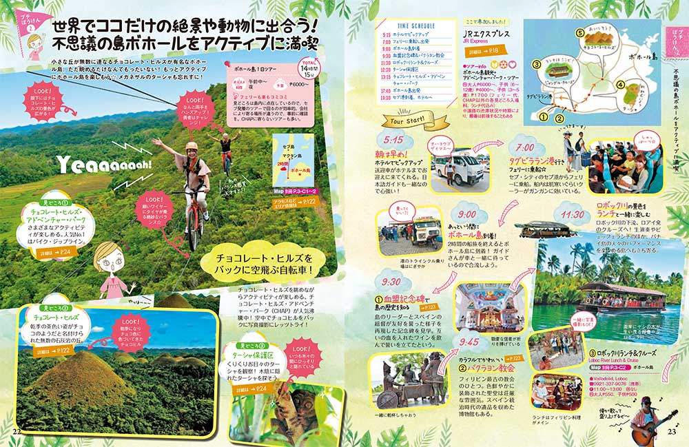 大迫力の「ジンベエザメスイム」、不思議の島ボホール島の「チョコレート・ヒルズ」、ディープな映えスポット巡り、神秘の島シキホールでGetしたい「ラブポーション」など、セブ&周辺の島を満喫するためのとっておきプランが満載!進化する最旬グルメ&おみやげ、スパ情報も要チェックです。