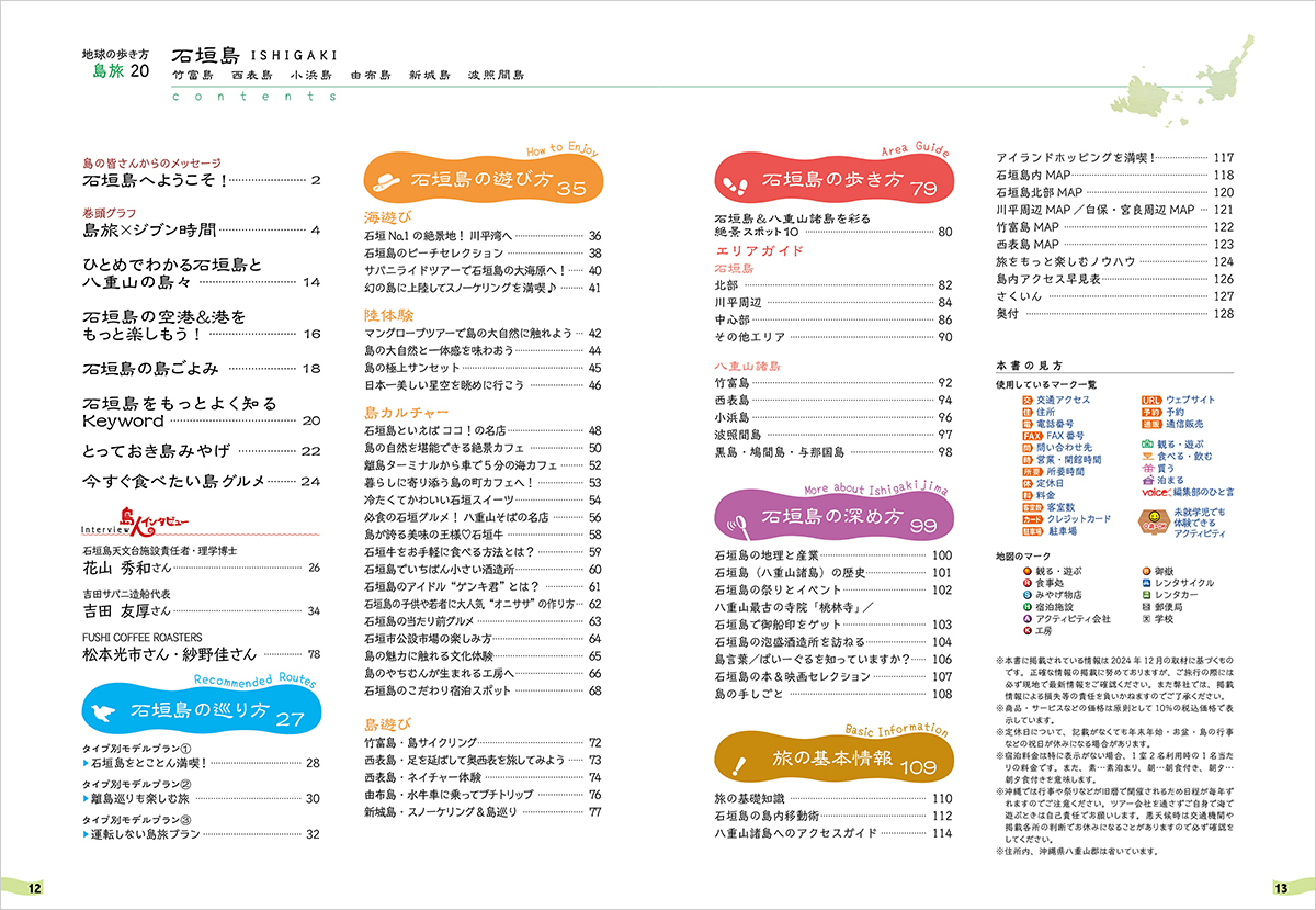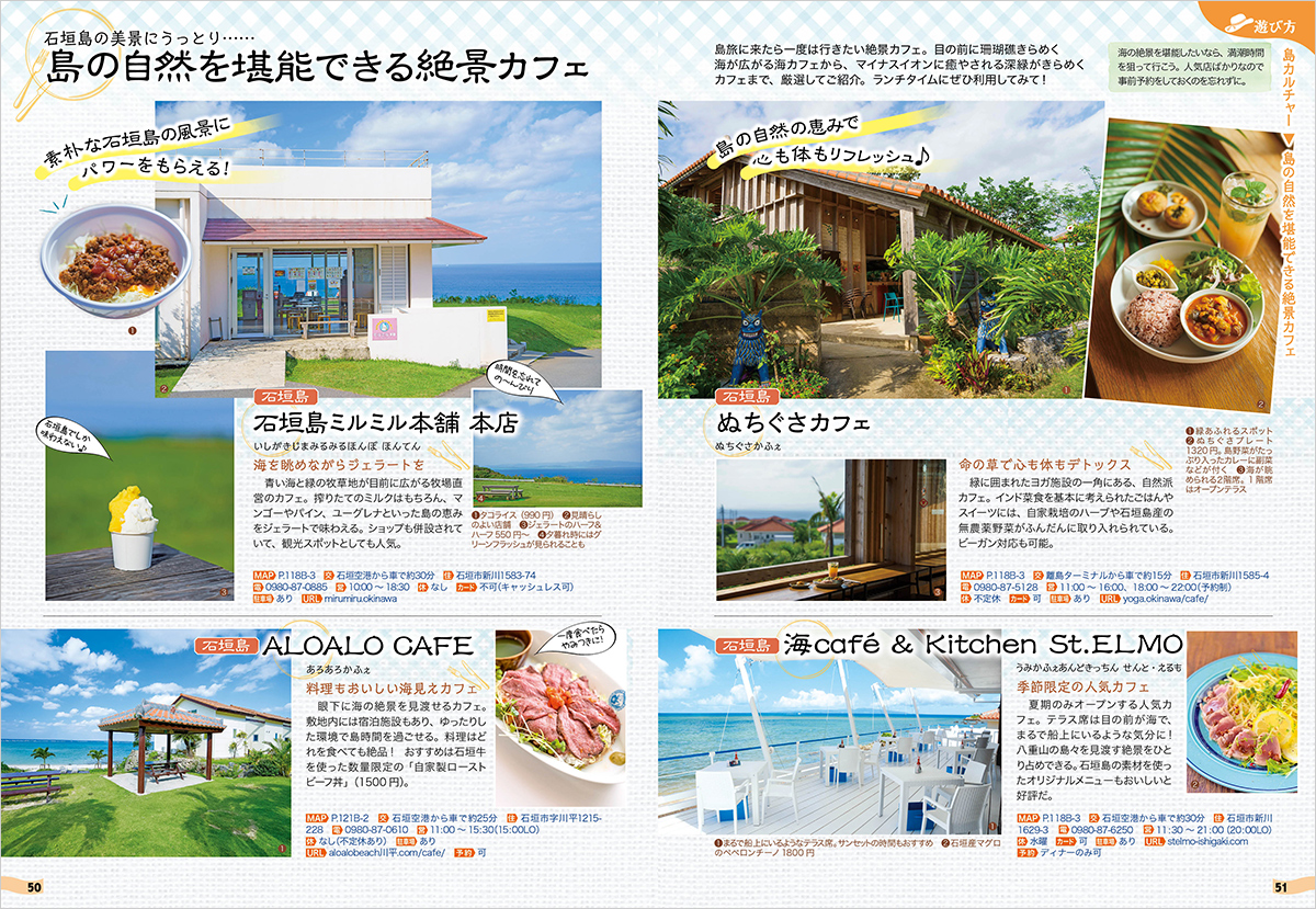 「島旅が200%楽しくなる」をテーマに、「観る・遊ぶ・食べる・買う・泊まる」の情報はもちろん、 絶景ビーチに多彩な海&陸のアクティビティ、地元でおなじみのグルメや商店、島の奥深さにふれる文化体験など、石垣島と周辺の島々をめいっぱい楽しむための秘訣を徹底的に紹介。