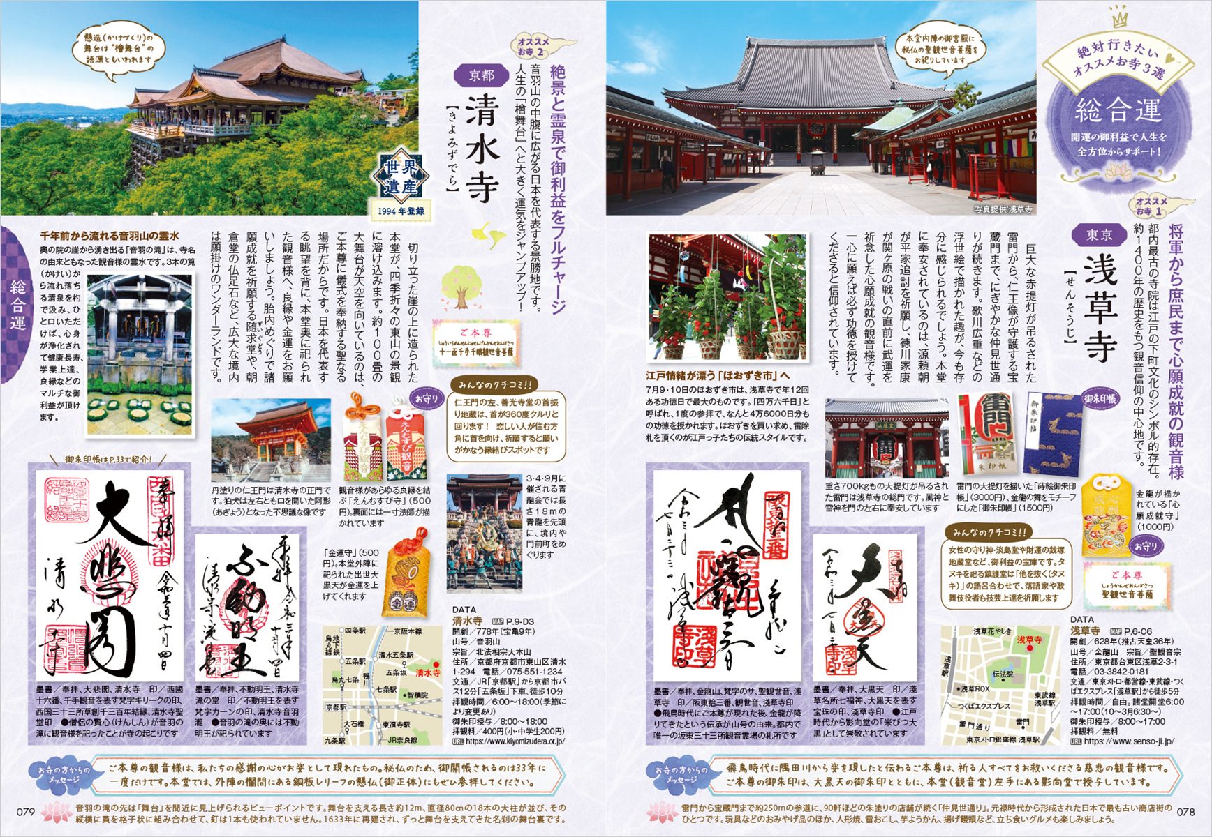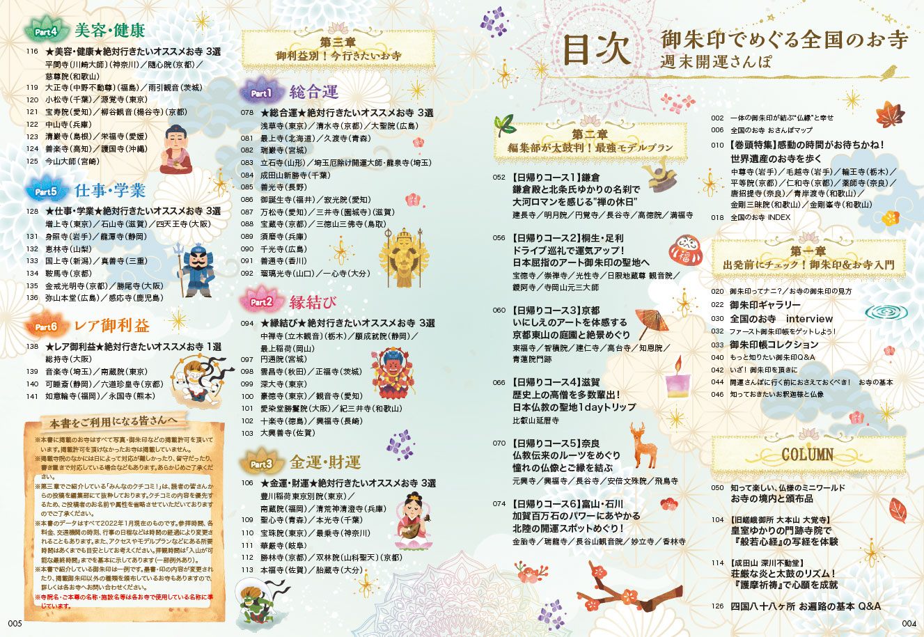 巻頭では世界遺産のお寺の歩き方を大特集! 後半のページでは縁結び、金運、仕事運、料理上達運、トイレ運まで、御利益別に123のお寺とその御朱印を徹底的に紹介しています。