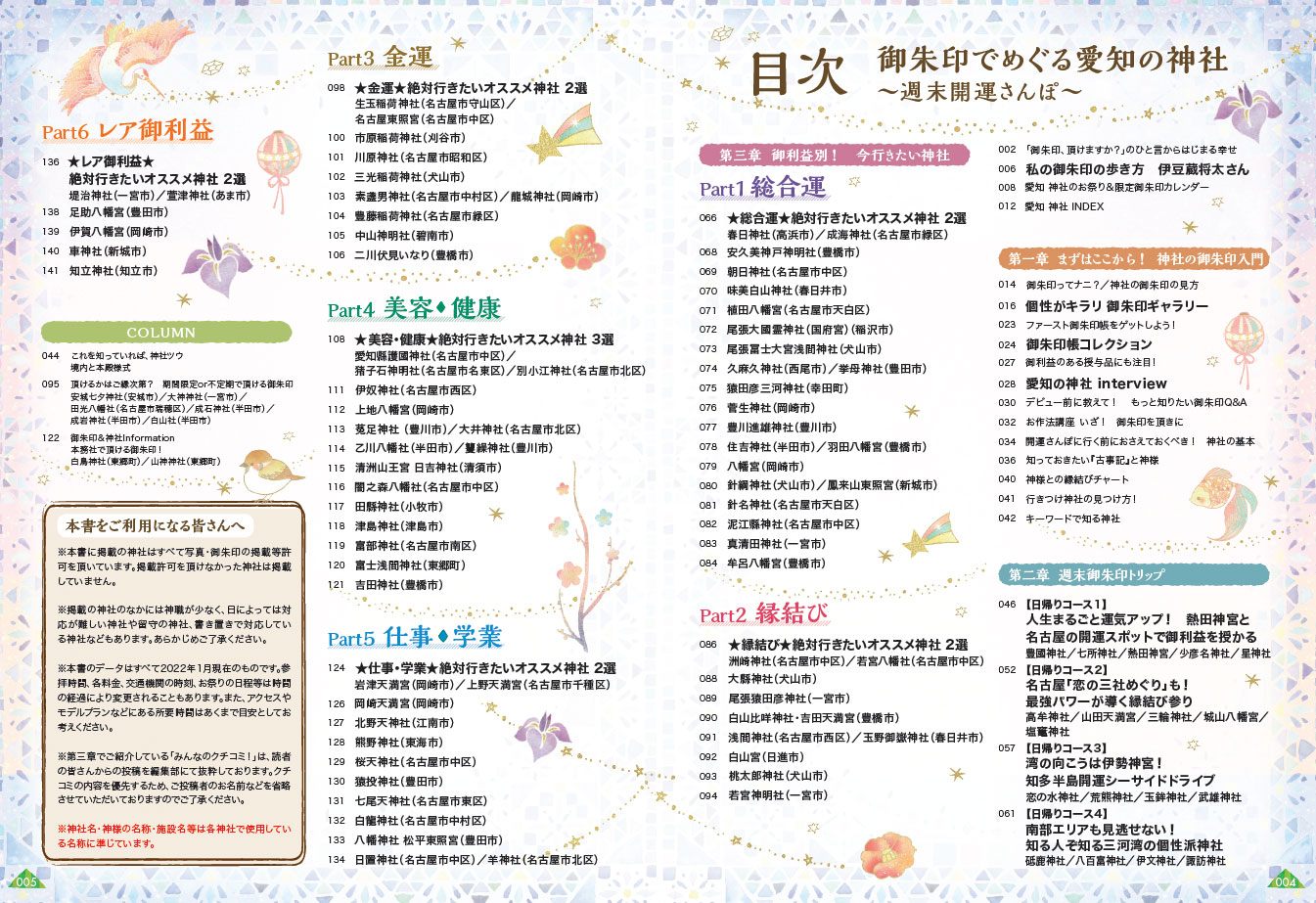 本書では「御朱印と御利益が凄い」と評判の神社を、愛知県の約3300の神社から厳選。縁結び、金運、仕事運から乗り物の安全運や漬物上達運(!)まで、御利益別に100の御朱印とその神社を徹底的に紹介しています。参拝方法、境内のしくみや神様プロフィールなど、初めてでもイチからわかる神社の基礎情報も好評。旅のプラン作りに便利なモデルルートやMAPも備えています。御朱印はこれからの人も、すでにの人も、本書と御朱印帳を持って旅に出れば、もっと楽しめる。もっと幸せになる。愛知県在住者と旅行者に必携の一冊になっています!