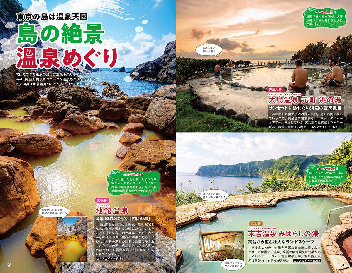 絶景in東京の島/イルカ&クジラに会える海/島のビーチ/島で整う。温泉&サウナ/星空ガイド/島トレッキング&登山の魅力/芋も麦も米も!焼酎パラダイス/島グルメ&ご当地食材/牛乳せんべいストーリー/スタッフ偏愛の島調味料/アイランドワーケーション/島の二度見スポット/行く前から島気分、竹芝桟橋徹底紹介/船旅の魅力