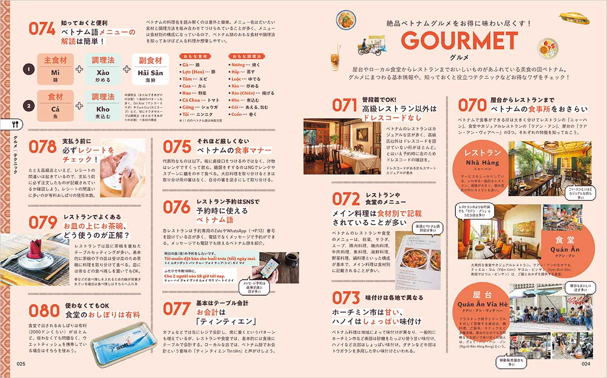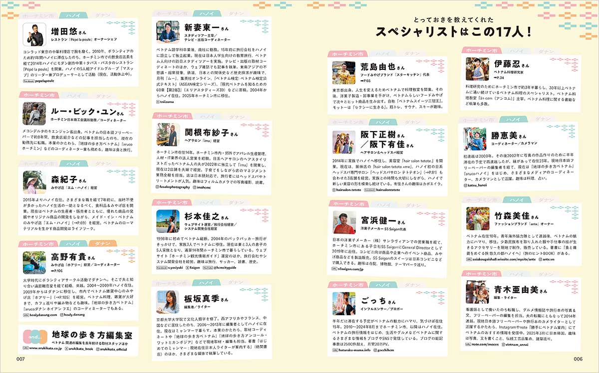 ベトナム料理研究家、長年取材を続けてきた地球の歩き方編集者、旅行業界のプロ、現地在住インフルエンサーなど、ベトナムを知り尽くしたスペシャリストたちが、旅のテクニックを300以上大公開。グルメやスパ、買い物などについては、スペシャリストが全力で推すスポットをランキング形式で紹介します。