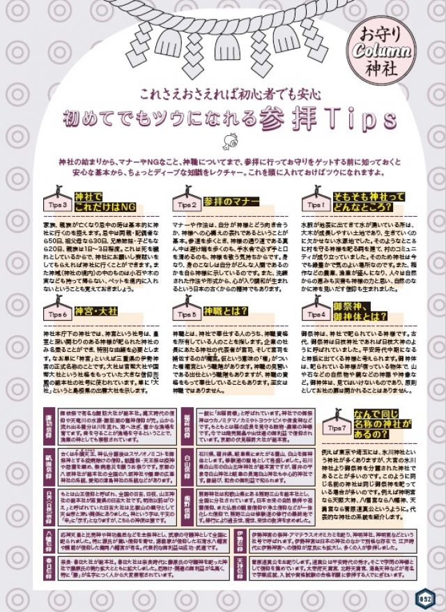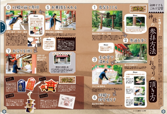 コラムもたいへん充実しています。「厄払い完全ガイド」「初めてでもツウになれる参拝Tips」「御祈祷ベスト10」「神棚の祀り方」「大祓のすすめと大祓詞」などをテーマに、思わず人に教えたくなるような神社や開運のとっておき情報を、たっぷりとお伝えしています。内容ぎっしり、読むだけで楽しく、ハッピーになる1冊になっています。今年は、本書とともに日本全国の神社を旅して、お守りを集めてみてはいかがでしょうか!