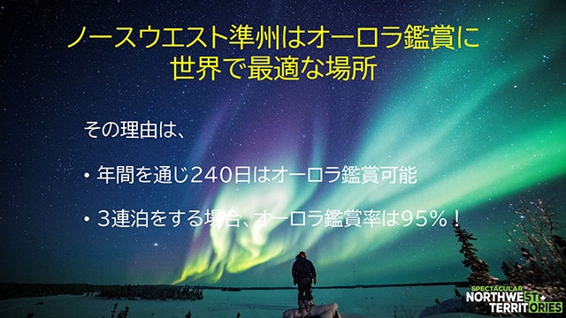 一時限目は田中さんからノースウエスト準州へのアクセスとともにイエローナイフはオーロラ発生が顕著なオーロラベルトの下に位置するため、年間240日以上も見られること。