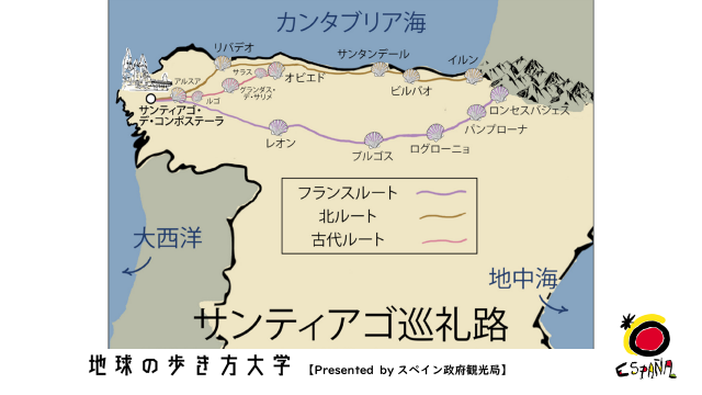 ガリシア州は独自の言語ガリシア語があり、また雨も多く、別名「緑のスペイン」と呼ばれているんですよ、と袴田さん。サンティアゴ・デ・コンポステーラの大聖堂にはキリスト十二使徒のひとり、聖ヤコブの遺骸があり、バチカン、エルサレムと並んでキリスト教の三大巡礼地と言われています。