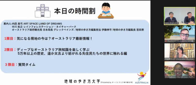 2022年2月9日(水曜日)20時~、オーストラリア政府観光局と地球の歩き方大学との共同企画『コロナ後の旅行計画に役立てよう!ディープなオーストラリア旅知識を楽しく学ぶ -5万年以上の歴史、遥か太古より紡がれる先住民たちの世界に触れる編-』を開催いたしました。