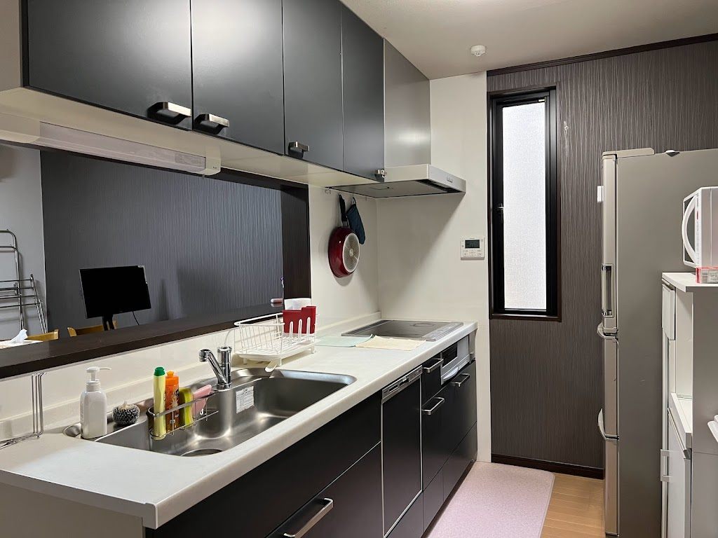 対面式のキッチン、広いバスルーム、洗濯機、電子レンジと快適に生活ができます。住宅街なのでとても静か。寝室も2部屋あり家族4人での利用には全く問題なし。