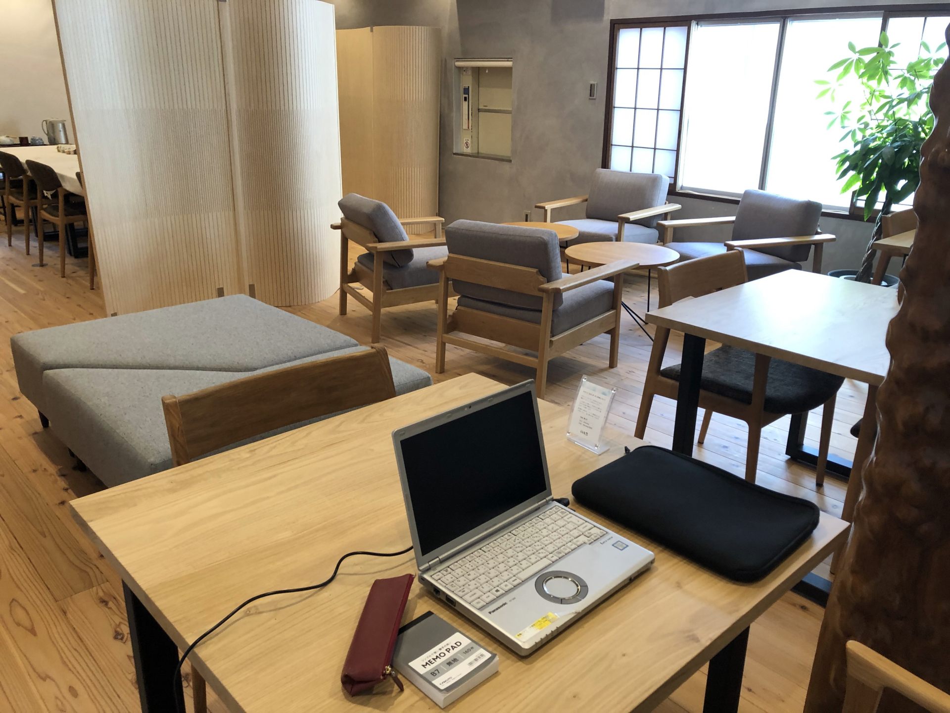旅館にはワークスペースが完備。広々としたスペースには観葉植物や木製のデスクが並び、落ち着いた雰囲気。高速Wi-Fi環境もあり、PCで作業するには全く不便を感じません。私が参加した日にはたまたま地元の珈琲屋さんの出展イベントがあり、美味しいコーヒーを飲みながら作業。まるでカフェにいるかのような気分で仕事も捗ります。